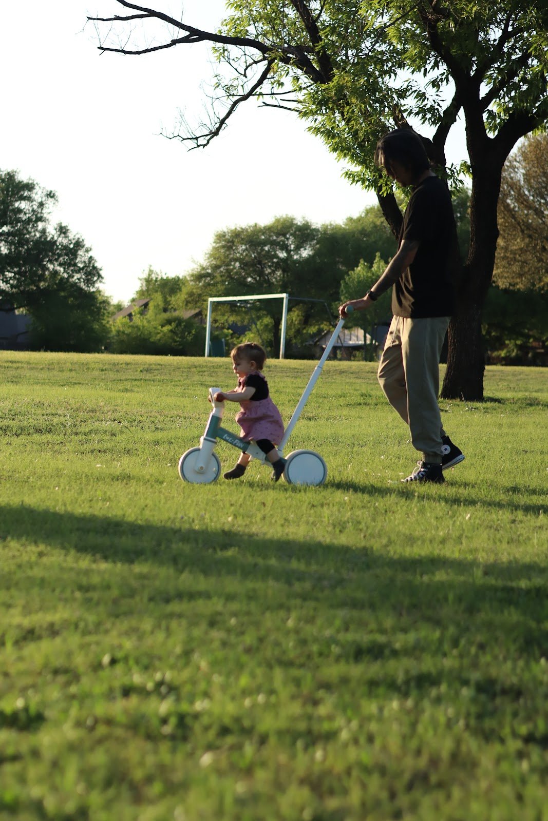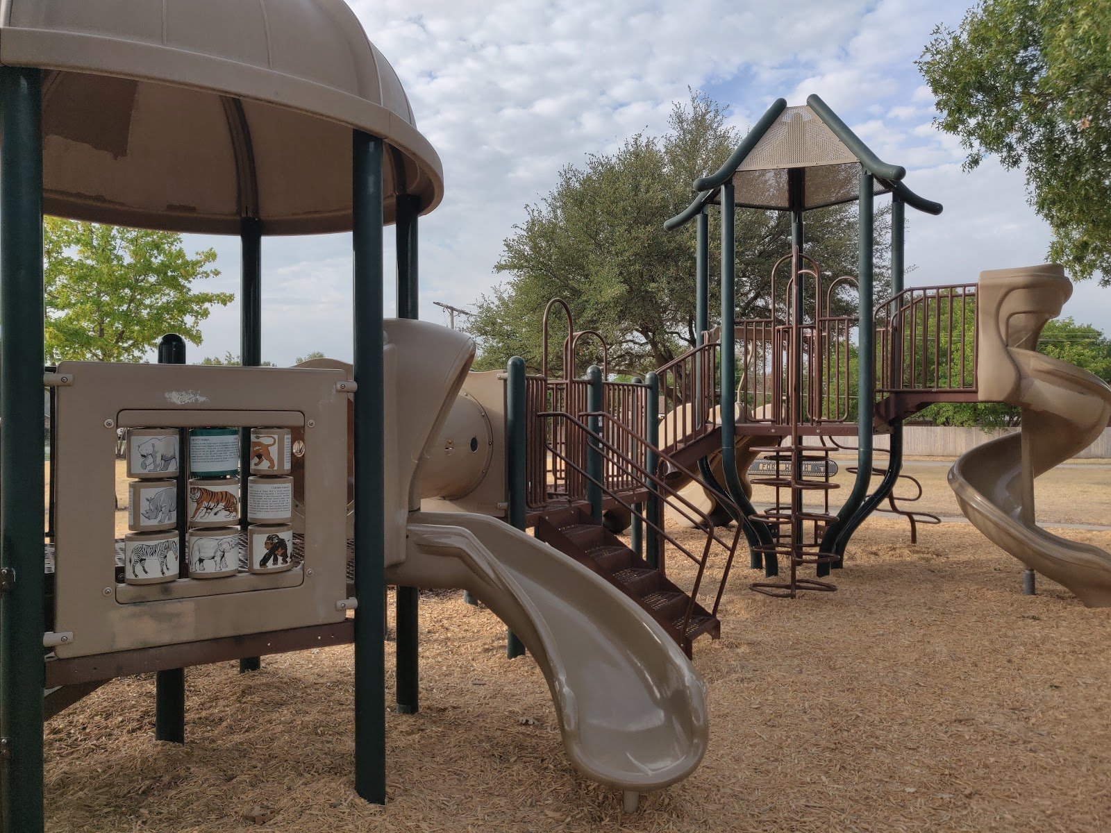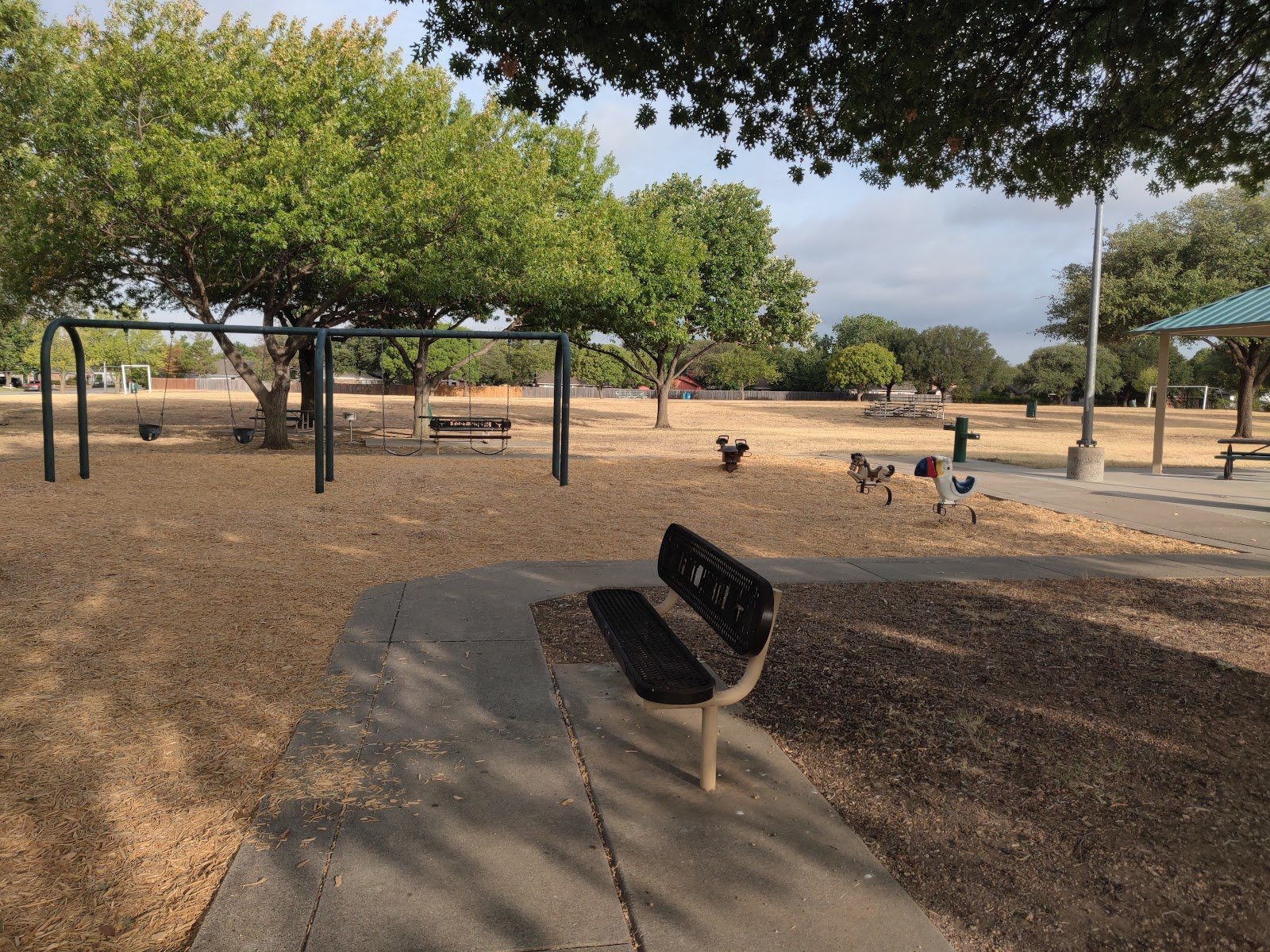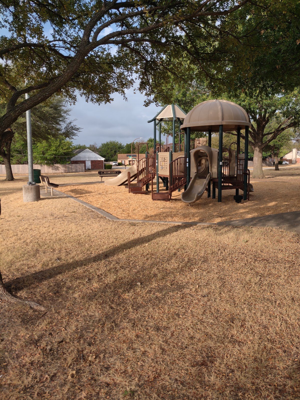 Peaceful park with shade, picnic tables, basketball, merry-go-round, swings, and playground area. Parking on street only.