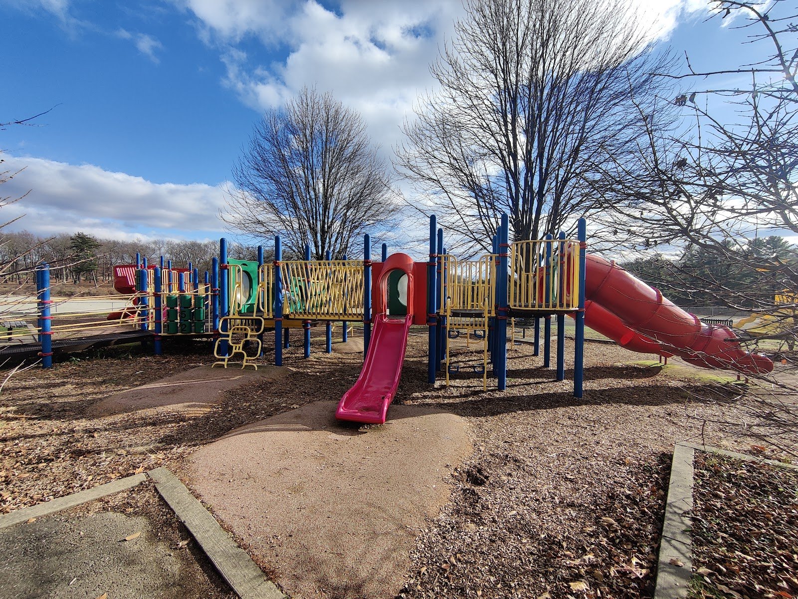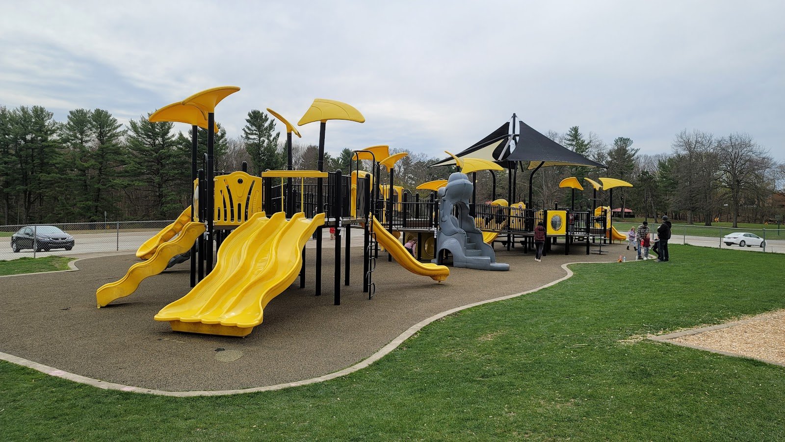 They have slides that are climbs, hiding places under the structures, roller/deck hockey rink with sport court across the street.