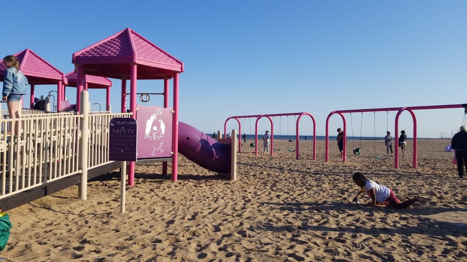 A wonderful dedication in honor of a student from Sandy Hook. Pink was her favorite color and the entire playground is painted so. What a great location on the sand looking into the Sound. Out of respect for parents and their children playing; pics are of the surrounding beach.
