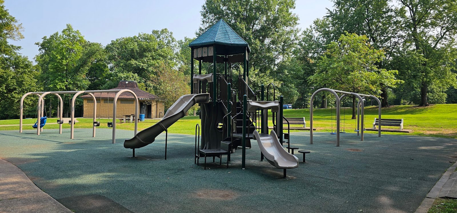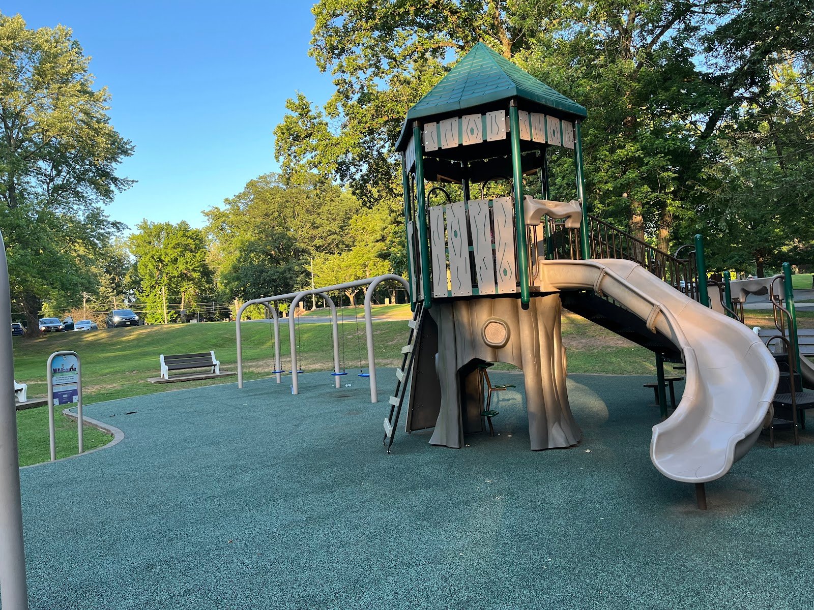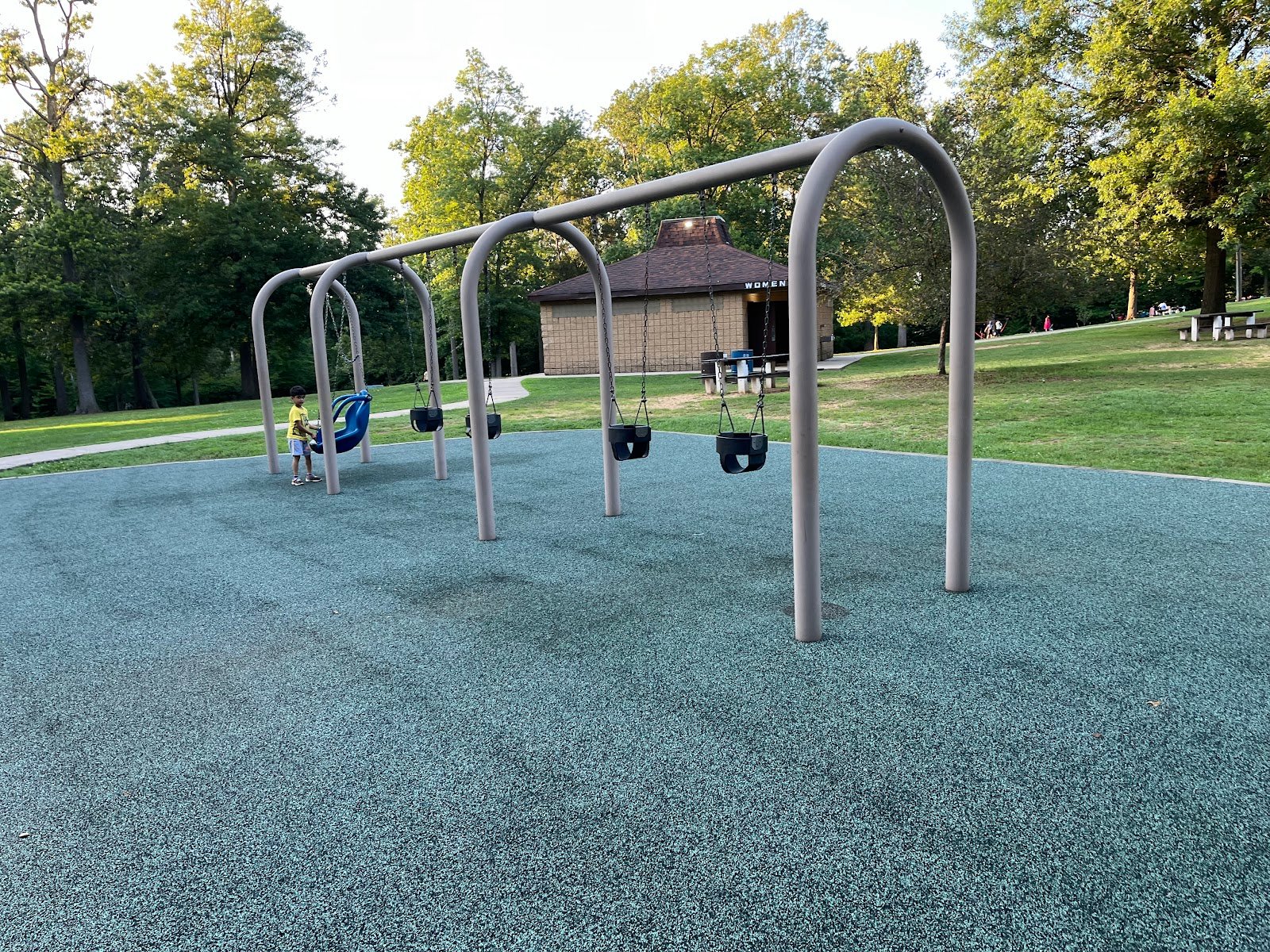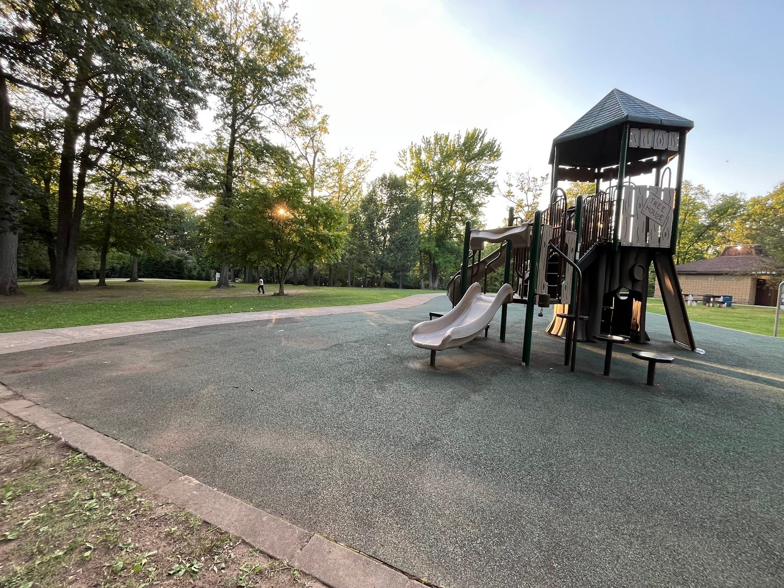 This particular playground is neat and has a good rubber surface within the Roosevelt park. The playground is equipped with Swings for kids and adults, Slides, elevated steps, rotators and surrounded by multiple picnic spots.