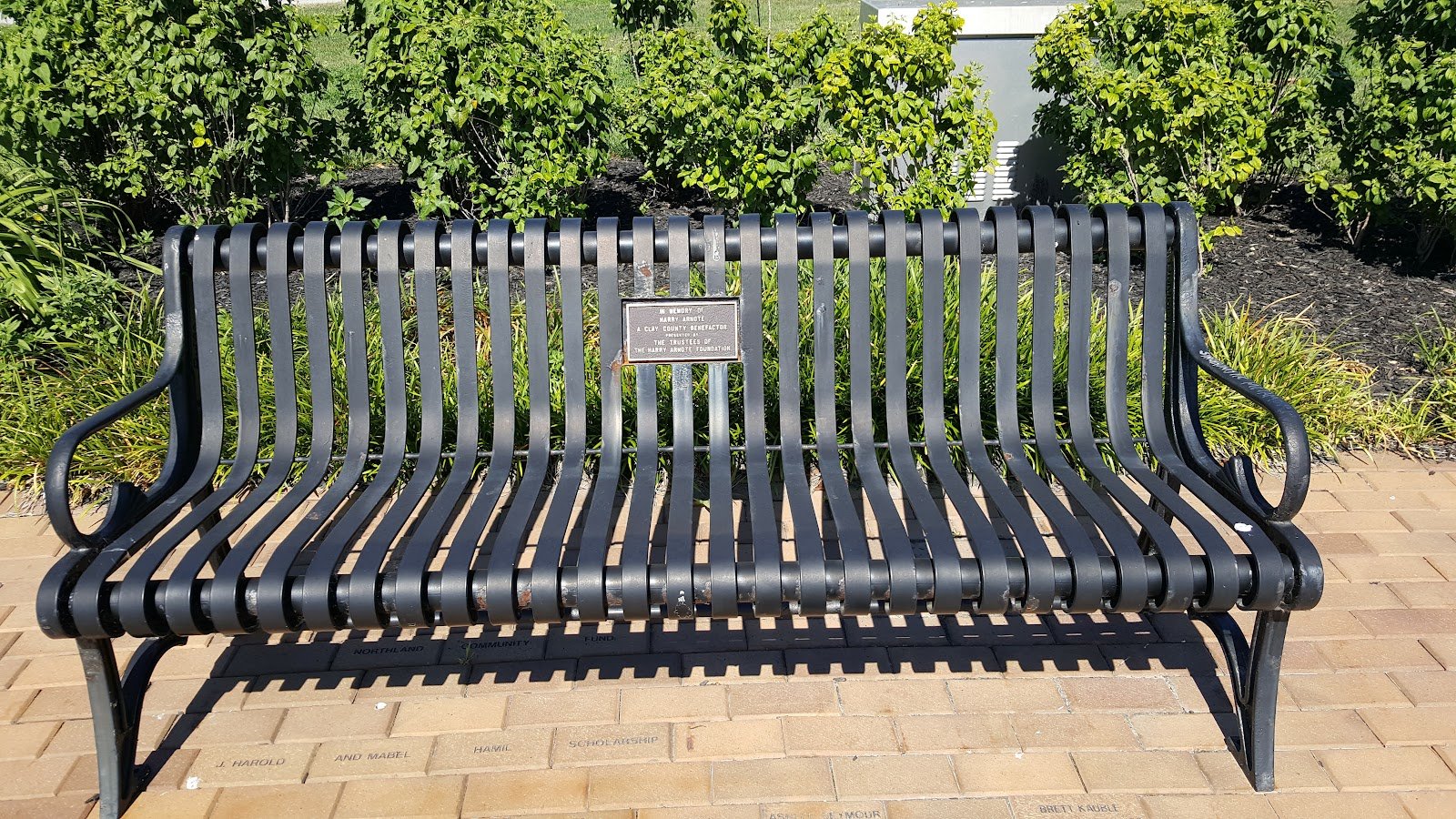 There are many benches for sitting and listening to the birds, the fountain, laughing children or the sounds of thunder just before you know the rain will pour. There are plaques for dedication of trees and on the benches as well. The walk way is nice and paved with many different flowers in bloom to brighten the area with: red, yellow, orange and white to contrast all the green grass, trees and bushes.