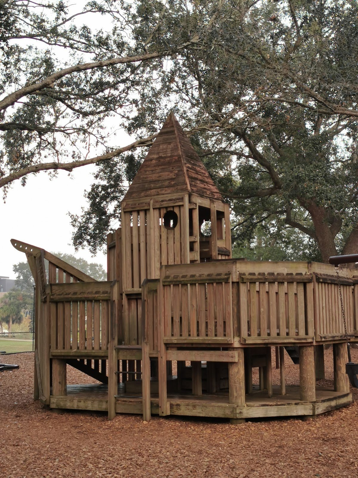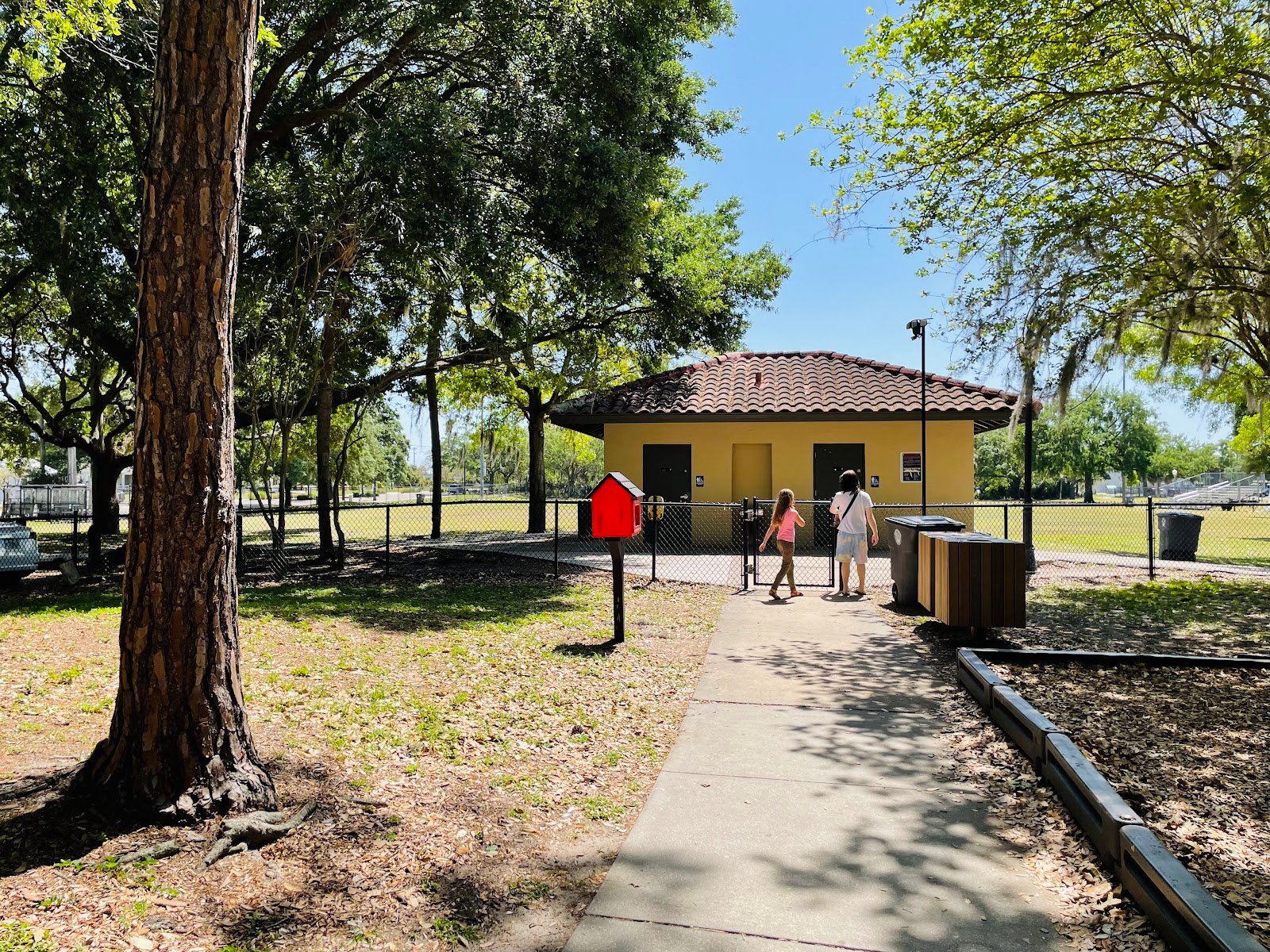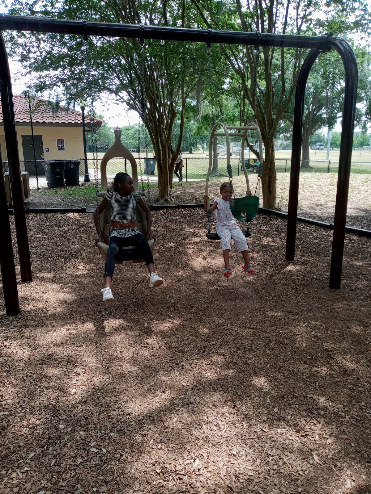 Very nice castle style playground with 3 swings and one slide. Big trees provide plenty of shade. Plenty of of tables and beaches to sit. Exercise area. Next to soccer and baseball fields. Bathroom available. Cool and fun in a secluded part of Winter Park.