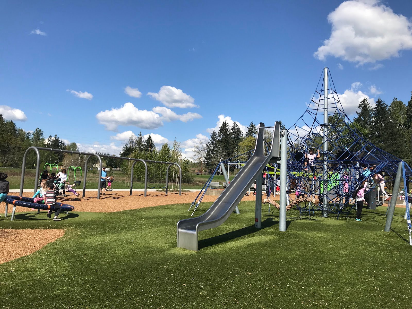 This park is very beautiful. It has a 2-5, and 5-12 kids area. The park is features a slide, climbing rock, zip line, and even special swings for kids and caregivers. The wetlands and forested path are a great place to walk to relax and be transported away from the city. There are 4 sheltered areas that can be rented, one of which is like a stage. There is a tennis court and soccer area, and even an adult workout area, as well as a running path all around the park.