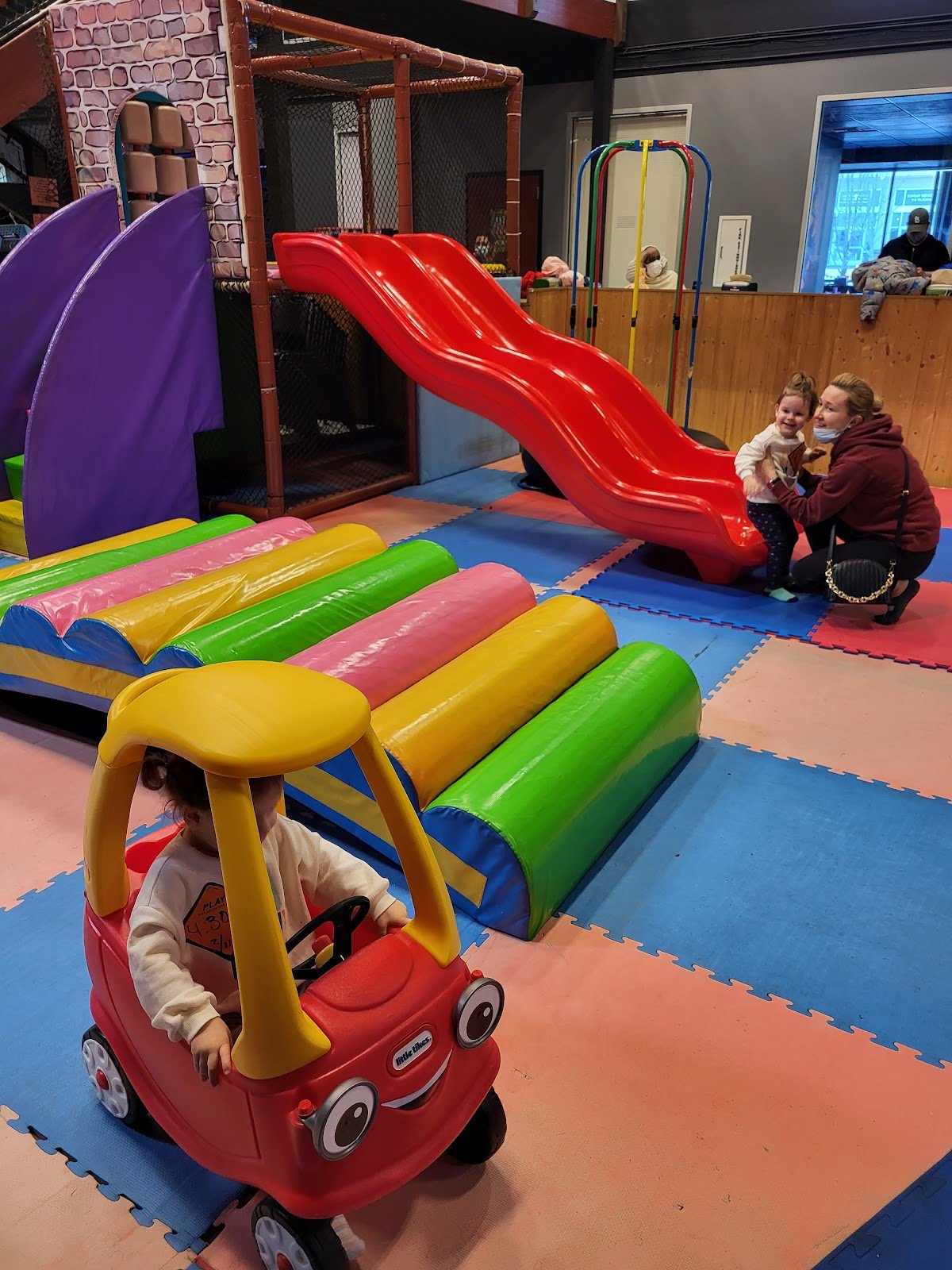 They do have a play place with slides that my son enjoyed. And little cars that he could push himself around in as well as a toddler area. But the fact that he was not allowed to jump because he was 2.5 really killed the experience for me. The height requirement was also annoying. Skyzone(Formerly DEFY) has a ninja course that is not age or height restricted…