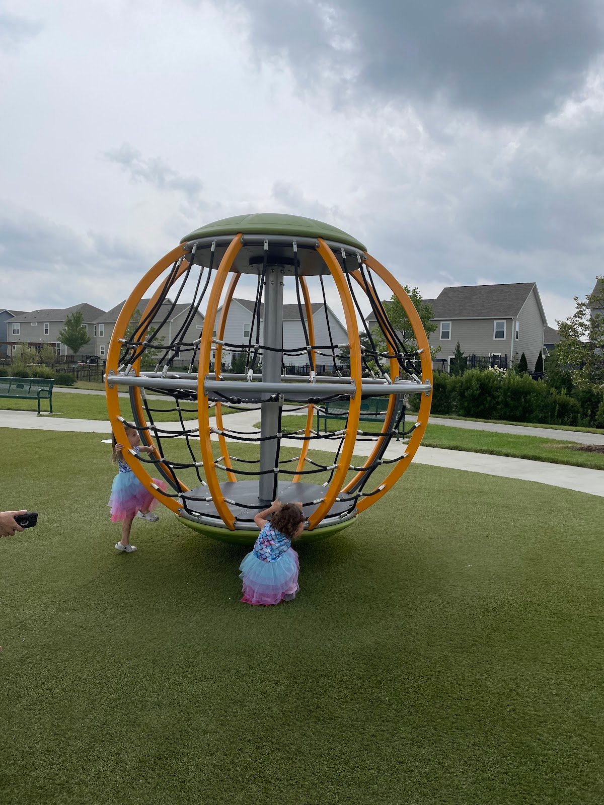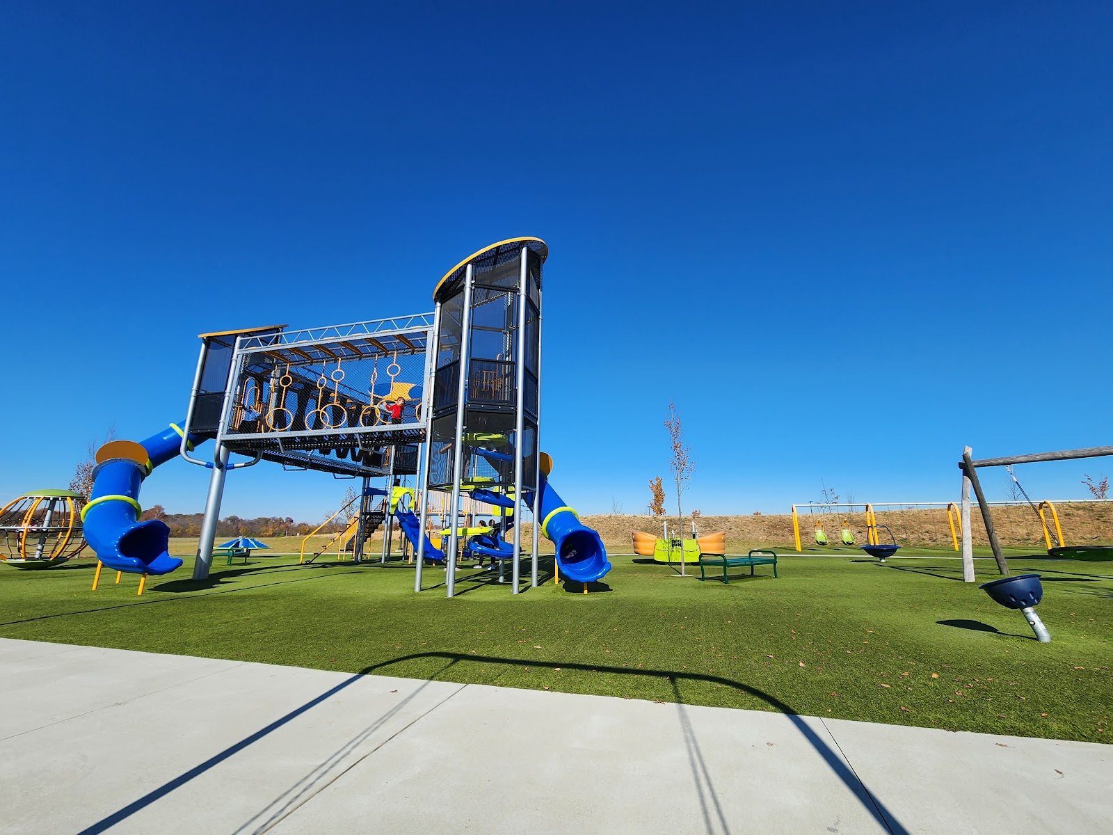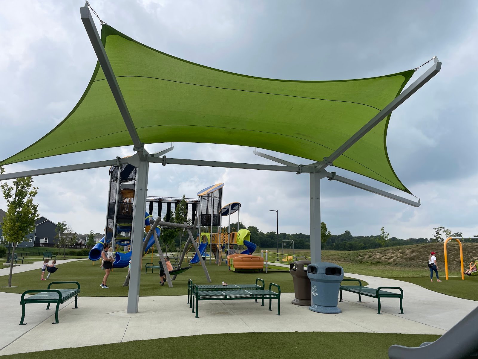 We love this park! Soft play surface and lots of fun playground equipment. Love that there’s an area for smaller kids and a music area. Plenty if covered areas and tables to sit at. Bathrooms on site. Having the splash pad next to the playground is awesome as well. Great way to wear out the kids!