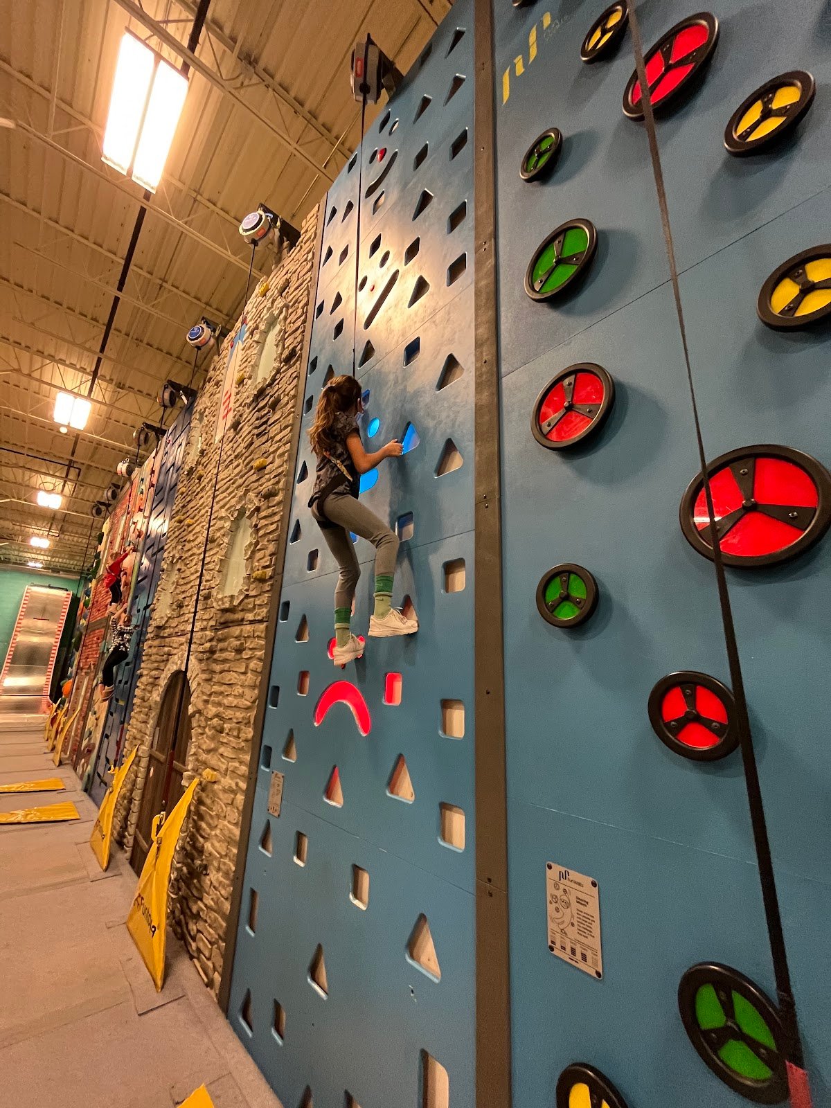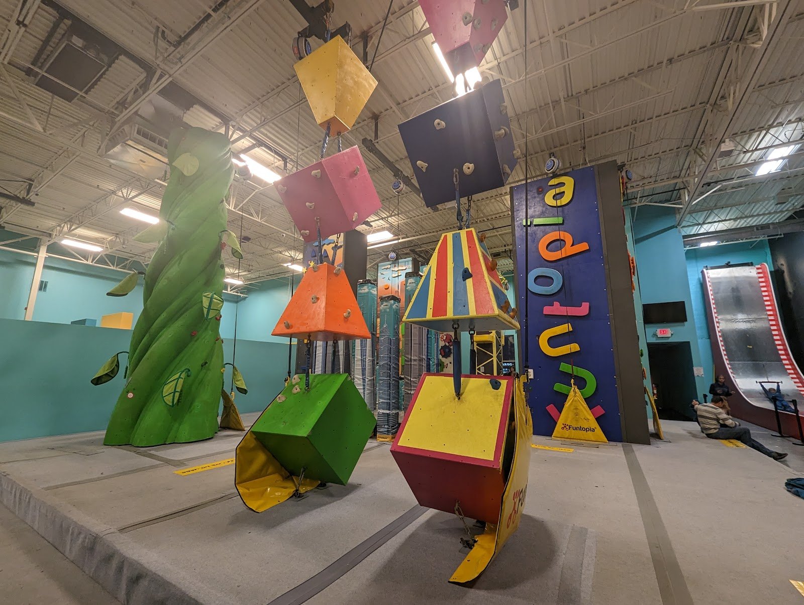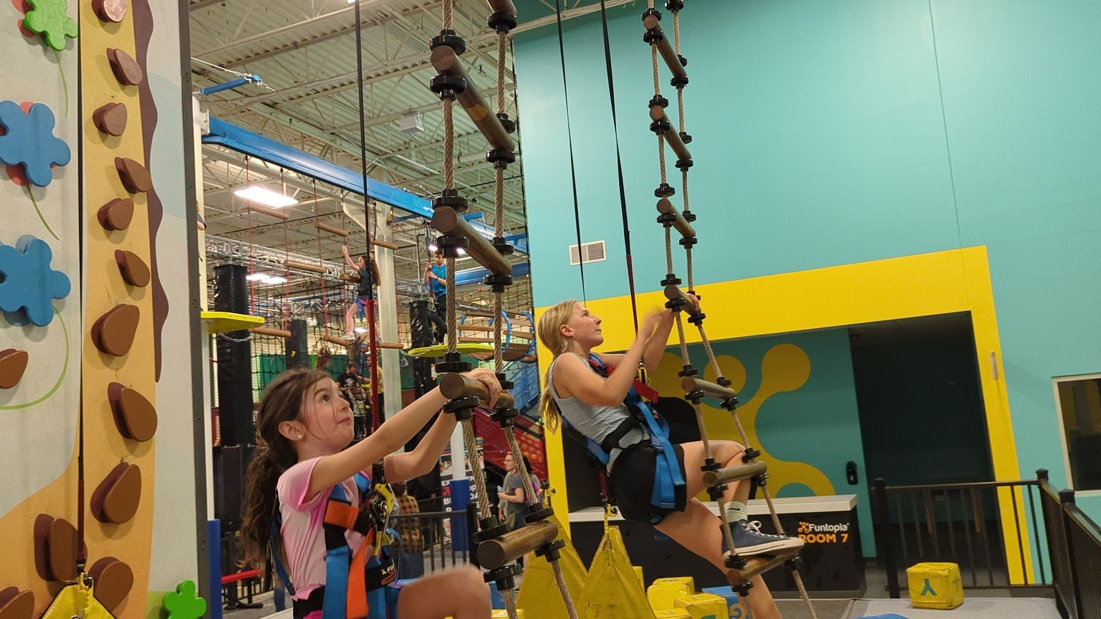 My friends and I brought our 5 children ages 6-12 to Funtopia. We spent $30/child for the all day pass. As this was our first time, I wasn’t sure if $25/1.5 hours would be enough time to enjoy the facility so we paid the extra $5. This is mostly a bunch of climbing walls: a whole line of them on one entire wall. Luckily, they also have a ropes course to walk through (above) which is in 1 big square (shorter/younger kids can get off half-way through if they are under 54”, the 2nd half of the ropes course is much more difficult, I would recommend for over age 8 or 9). The ropes course is pretty scary, some of the kids told me so just keep this in mind, especially the 2nd half. They also have the Ninja obstacle course in the middle of the place and a giant metal slide that kids grab the bar and it pulls them up (they wear a huge body suit thing). Since this is so much upper body/using your hands to grip, the kids hands begin to hurt after a while. They also get really hot, so I would recommend lighter clothing (short-sleeve t-shirt and good gym shoes). They do have a water fountain available. In hindsight, I think 1.5 hours maybe would have been enough time as they were getting pretty exhausted when we hit the 2 hour mark (which is when we left). They only open the ropes course and giant slide when it is staffed, so it is not always open. So once they make the announcement to open these areas, I would encourage your kids to try it out if they are interested because it quickly closes again. We went on a Sunday afternoon and it was pretty slow (20 kids about). There is a small toddler area with flimsy bounce houses (the shorter kind) for younger kids around age 3. Overall, it was a great adventure. As it was our first time, I’m glad we got the all day pass, but in the future, I think I will go for 1.5 hours as they know what they are doing now. Enjoy!