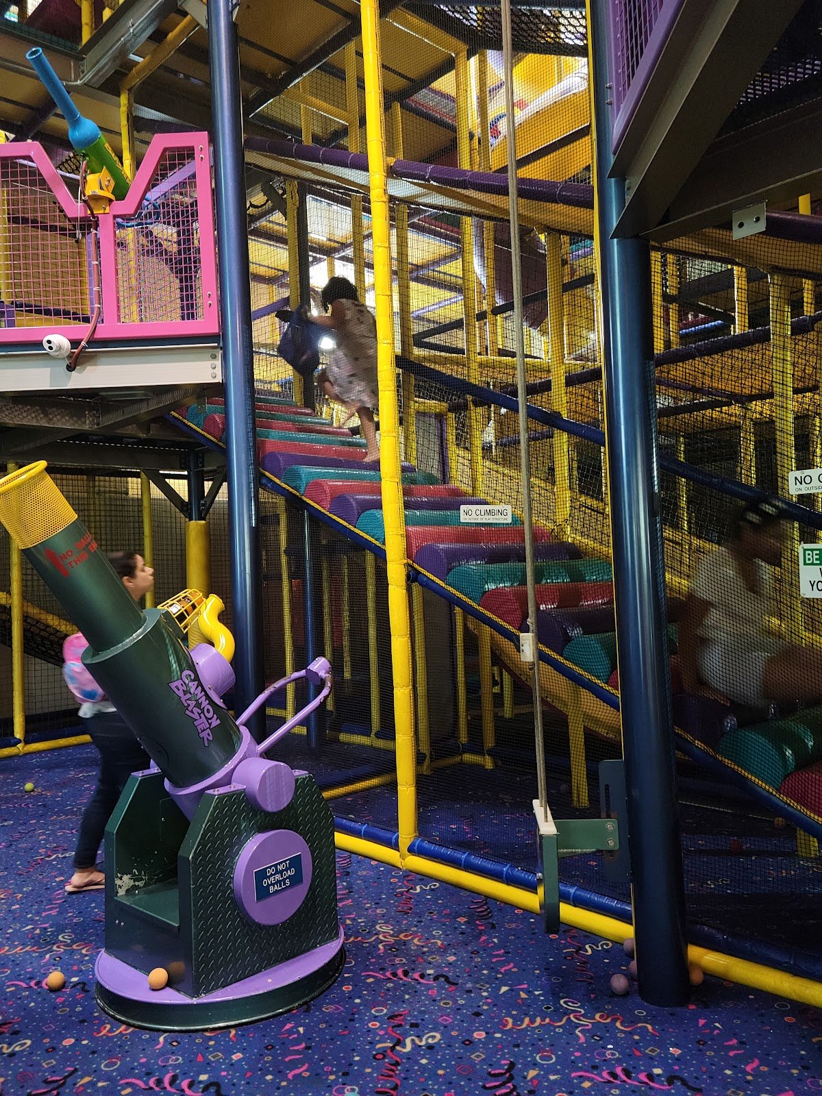 Indoor activities for kids including: arcade, carousel, “mountain” (fun obstacle course, ball cannons and ball volcano, cafe, toddler room.