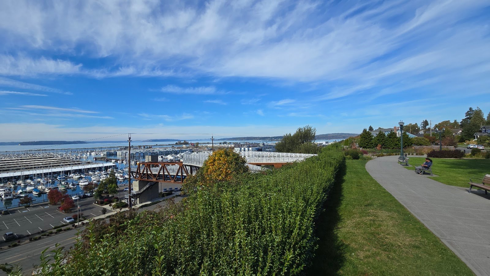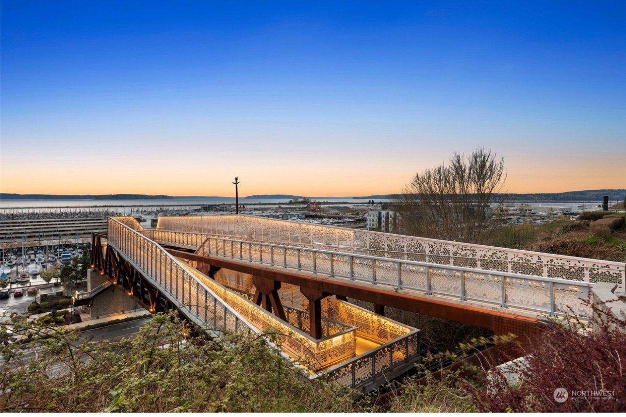 Beautiful park that runs along a great neighborhood. Amazing views, well worth the visit. Parking along the street was no problem during the day. Picnic tables and cement paths. Stairs or elevator. Accessible.