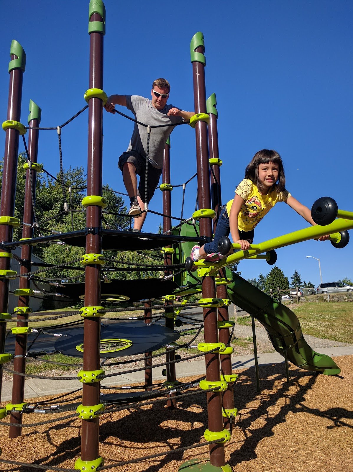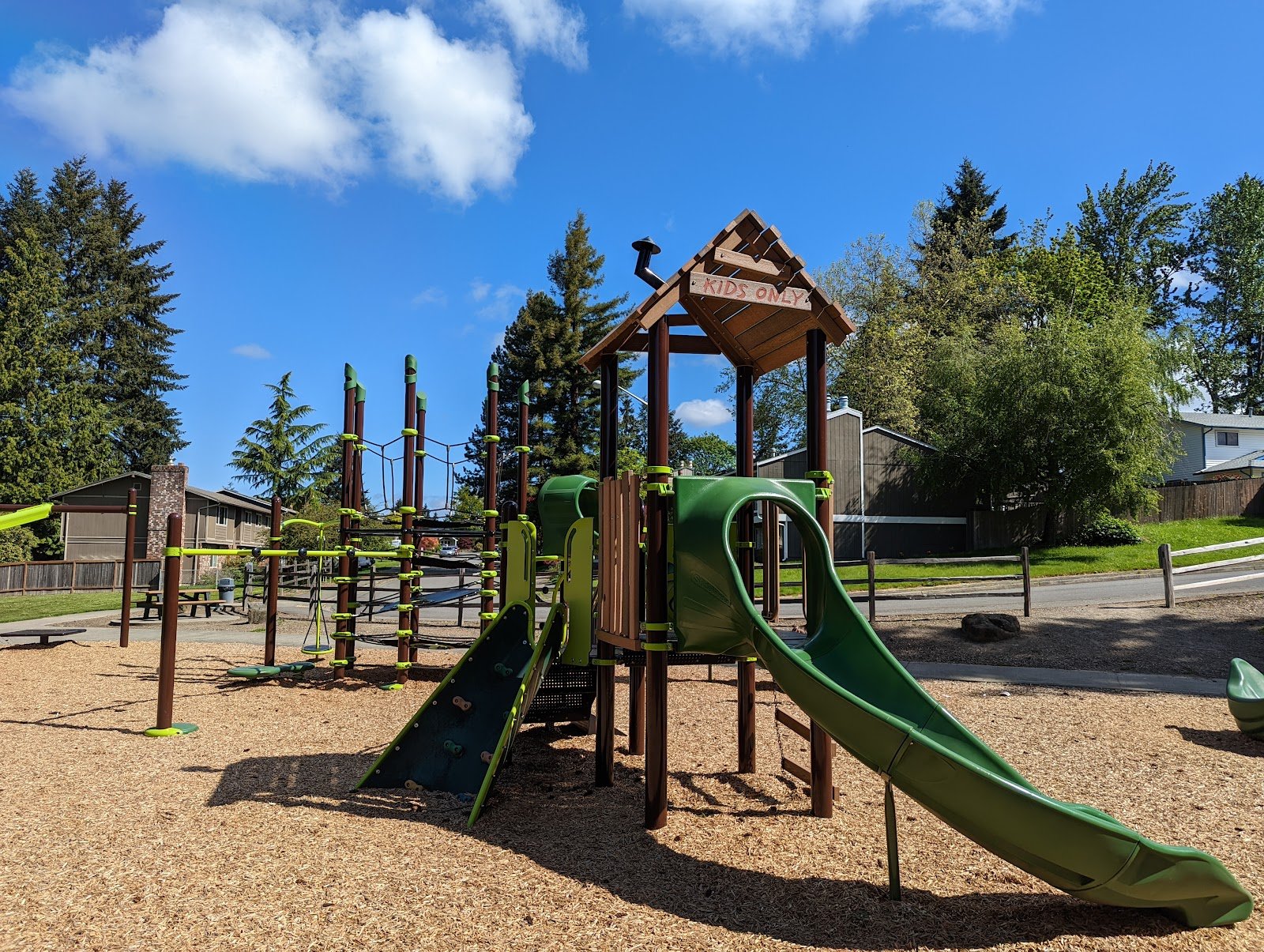 Fairly calm neighborhood the side. One street (on the side furthest from the jungle gym) the cars are going down a hill rather fast into a school zone so just watch out for that. The other side, closest to the playground) is very calm with almost no cars. Parking is on the street. All equipment is new. I didn’t see a bathroom which is a minus. The park has lots of green space and plenty of options for kids of all ages. Highly recommend.