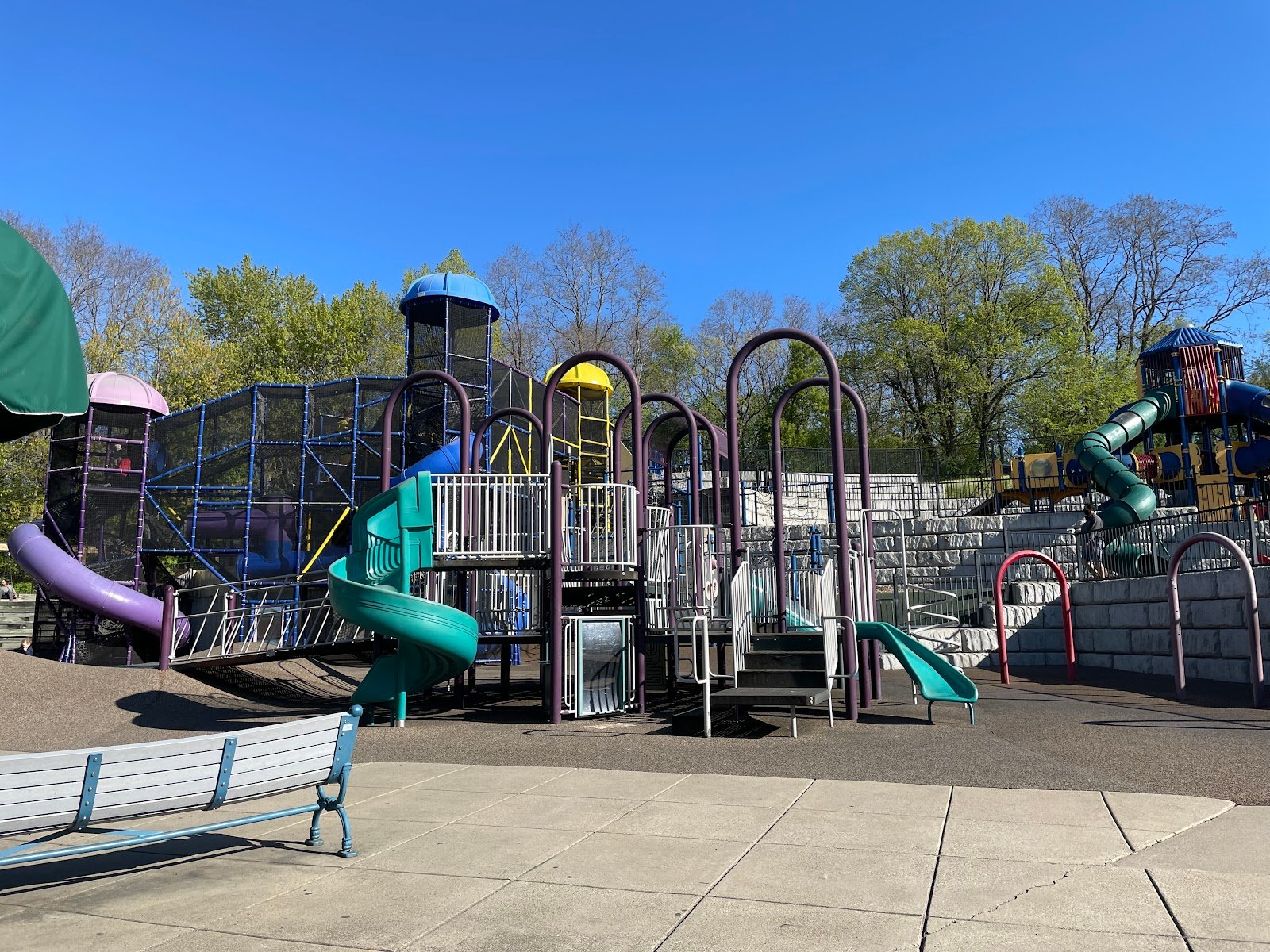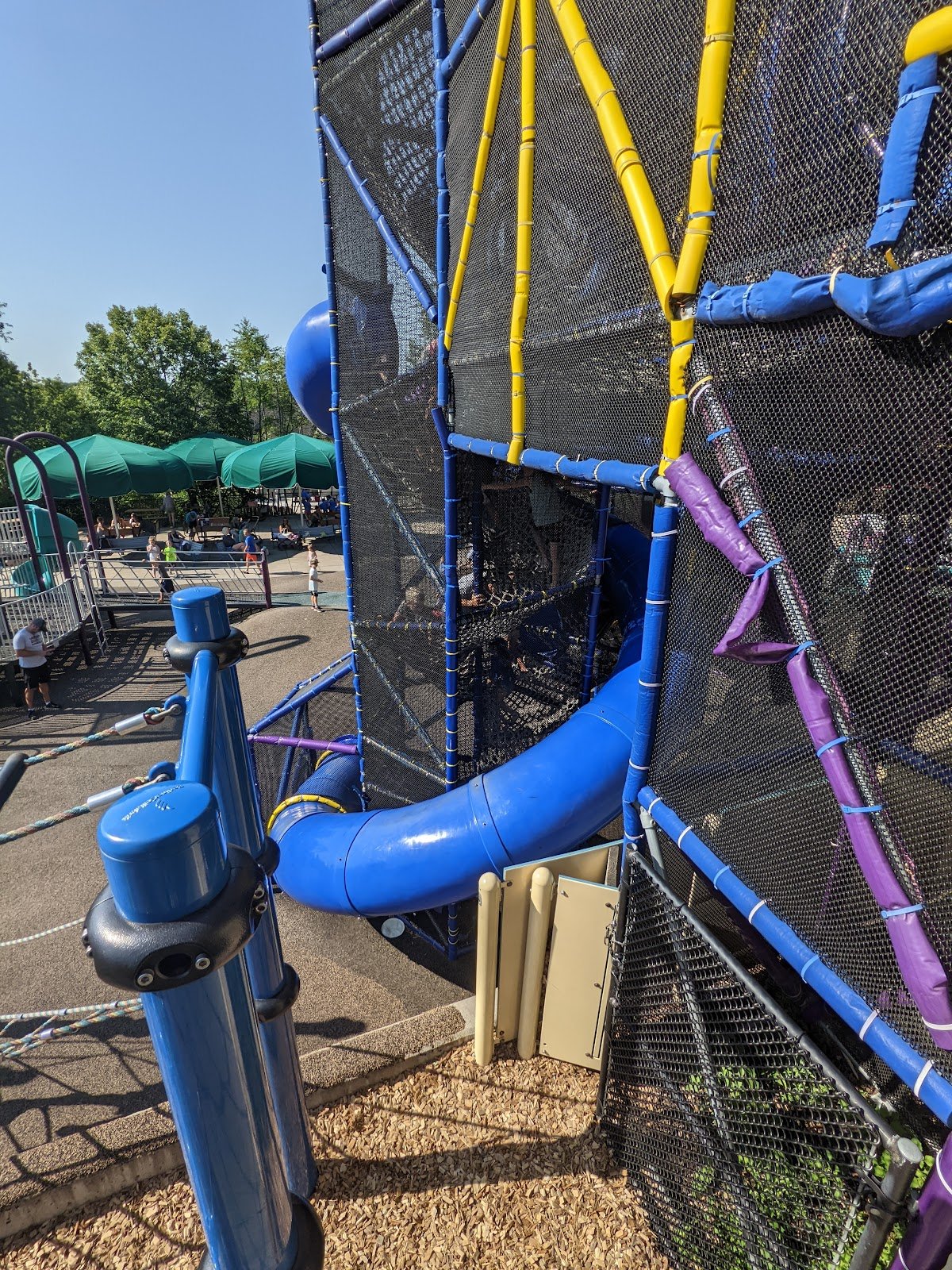 Hyland Lake Park Reserve’s ‘Chutes and Ladders’ playground, part of Minnesota’s Three Rivers Park District, is a high-quality play area designed by industry leader Landscape Structures. This playground features a unique ‘Roller Slide’ element, which I have incorporated into many playground projects throughout my career. The sprawling, multi-level structure offers an exciting adventure with extensive slides, climbing nets, tunnels, and rock walls. The playground is divided into age-based sections, including dedicated toddler areas, ensuring accessibility for all. However, the main playground can become crowded on warm weekends, making it challenging to keep track of children. If you’re looking for a top-notch playground experience, make sure to visit this premier destination playground in the metro area.