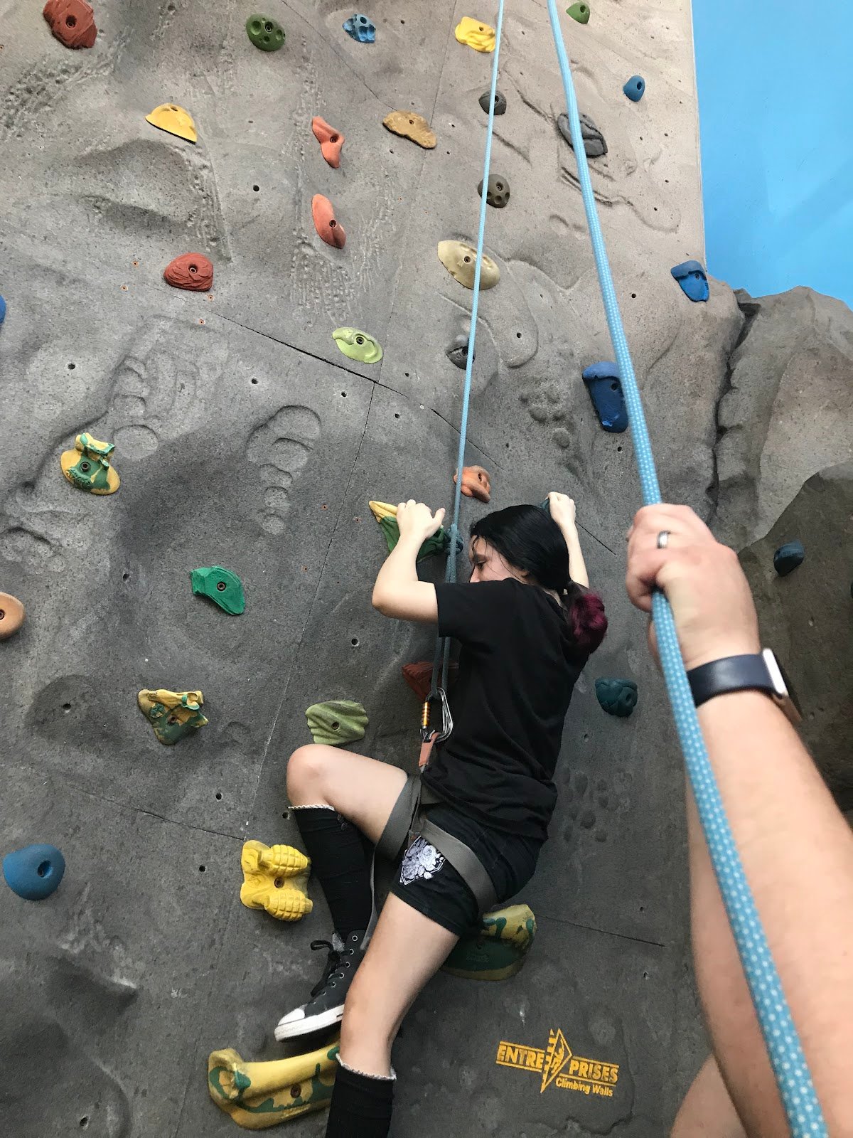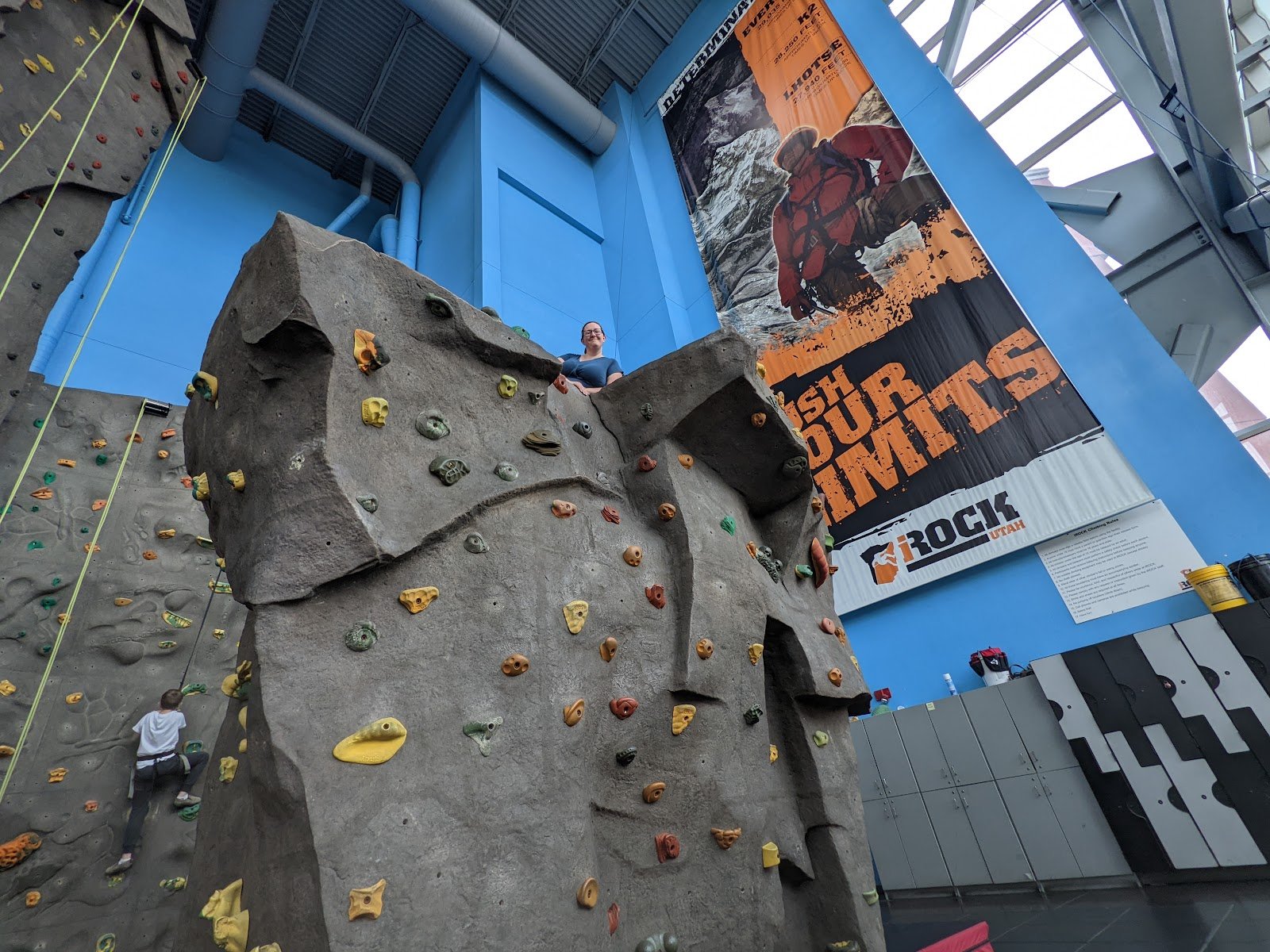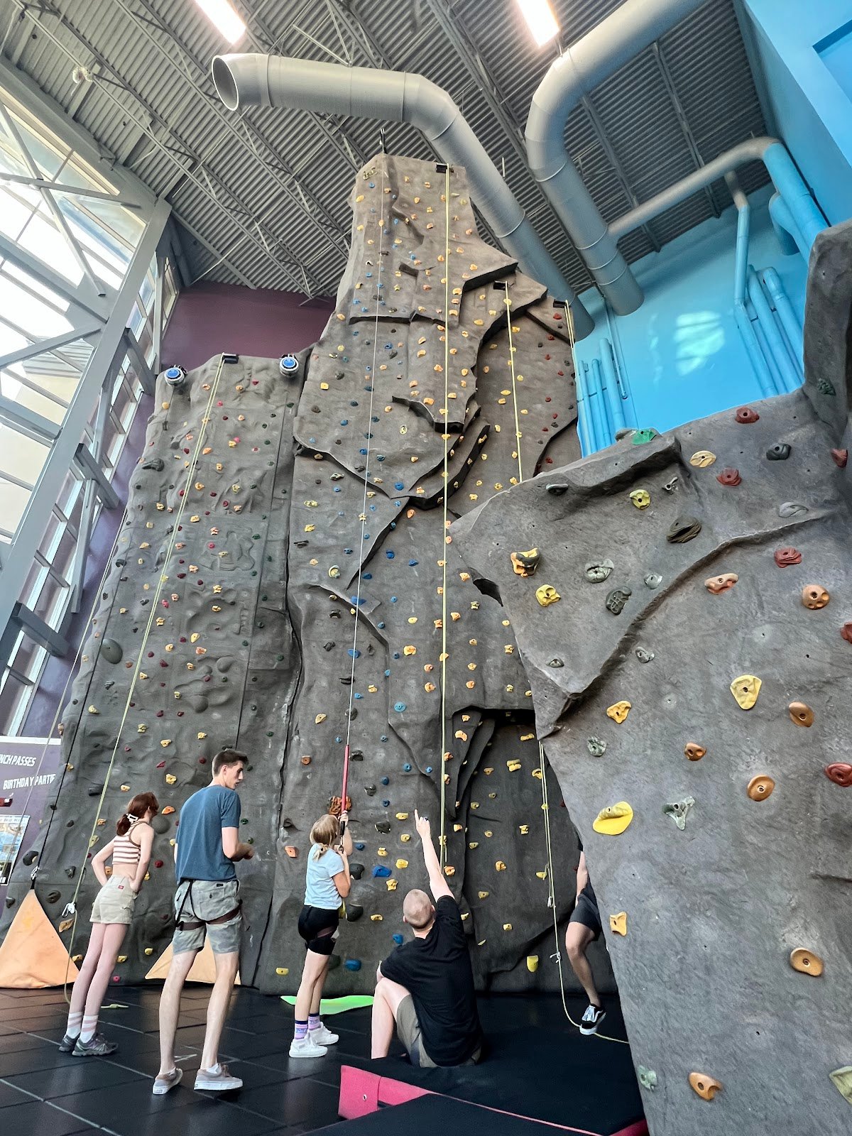 4 clip in auto-belayers that don’t require a spotter and 6 belay of various heights and one 10 foot free climb area. Emma was a great instructor and helped out getting everyone set up. Great prices too, and even better if you Groupon for Rick climbing, sky diving and indoor surfing
