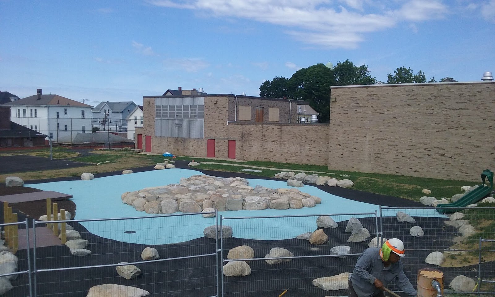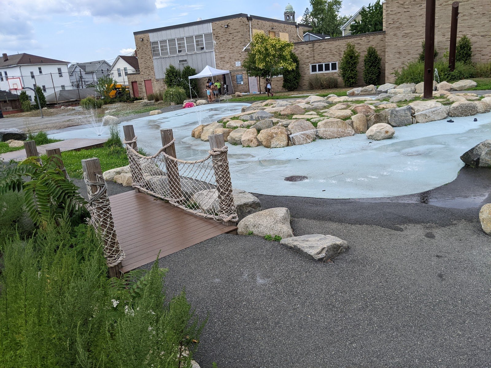 It’s kid friendly. It has a soccer field. It has a playground. And it has a basketball court. It also has like a little water park. And a big open field to run.
