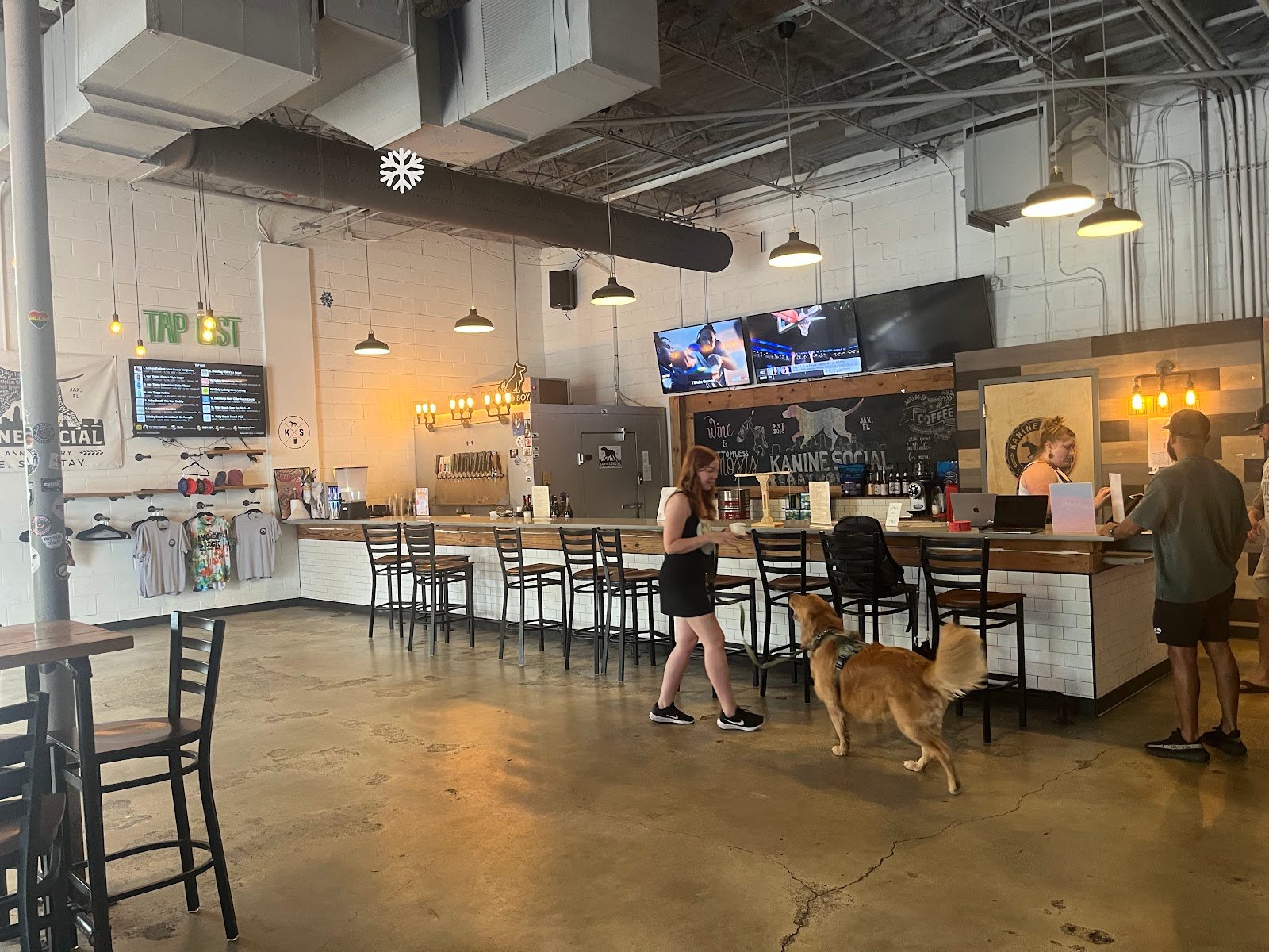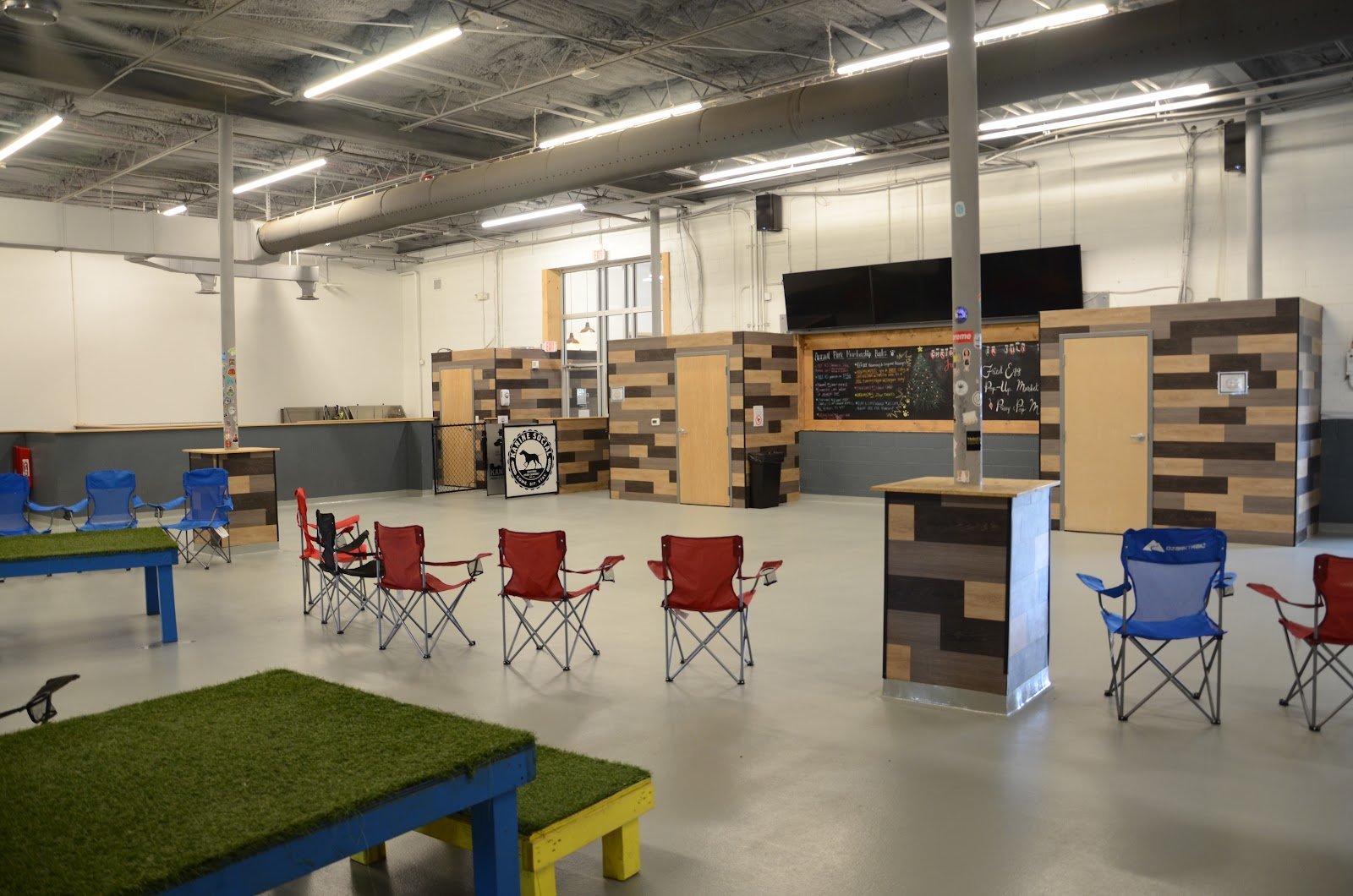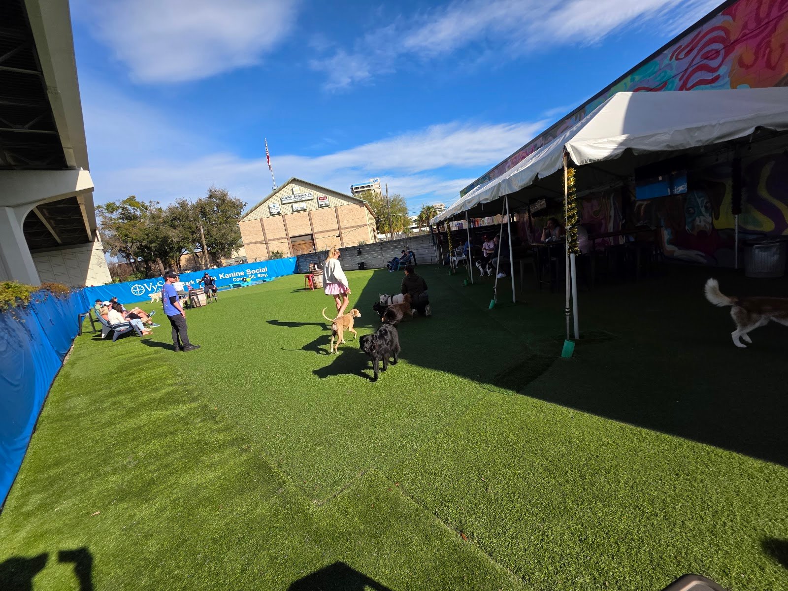 Indoor/outdoor dog area with fun events. Close to 5 points area. It is membership based so check if they have a special going and be careful not to indulge in too many adult beverages at the bar.
