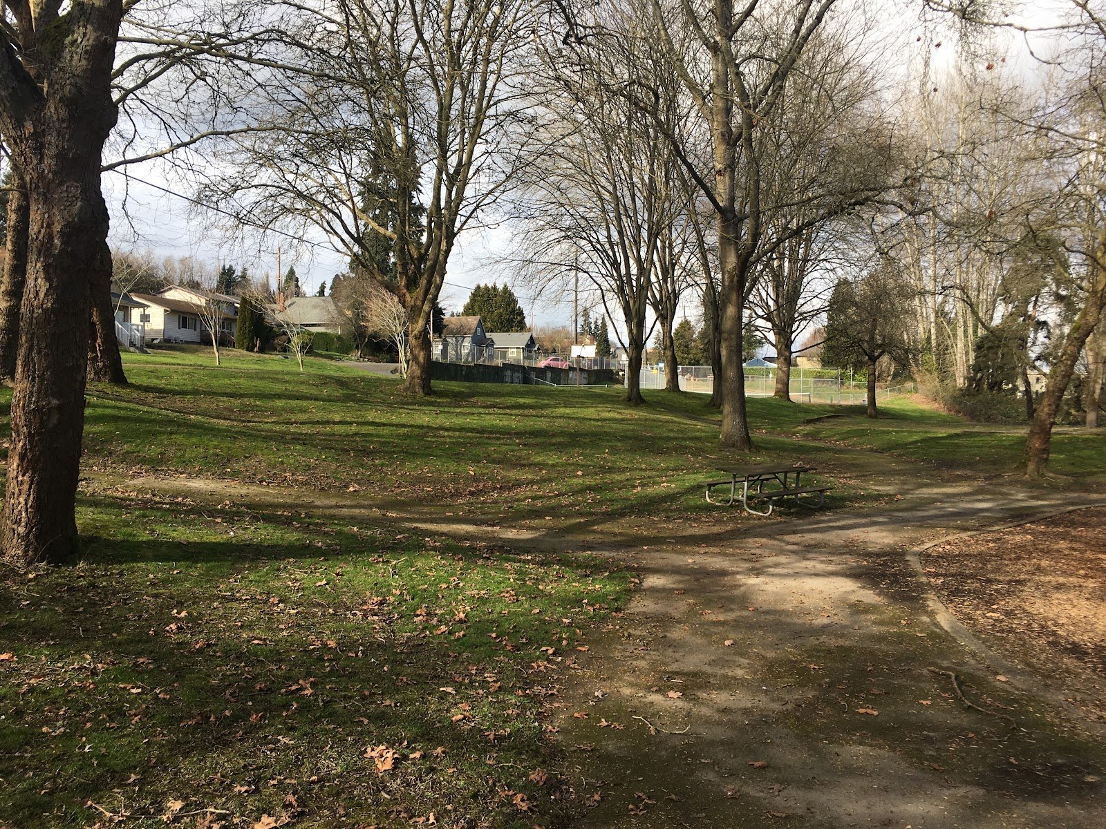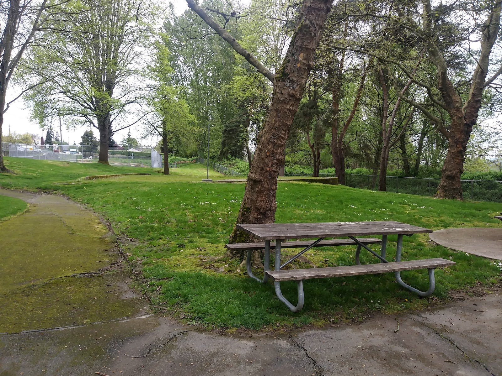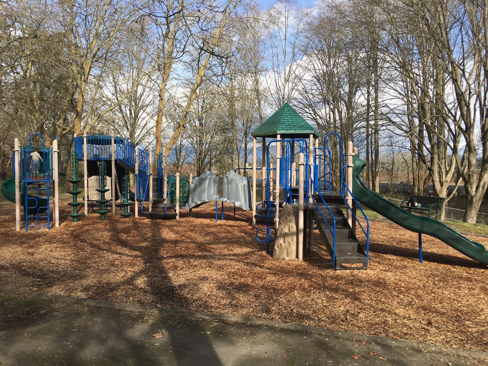 Sweet little park with a couple of picnic tables, fun swings and climbing toys with slides. Beautiful old trees, very peaceful.