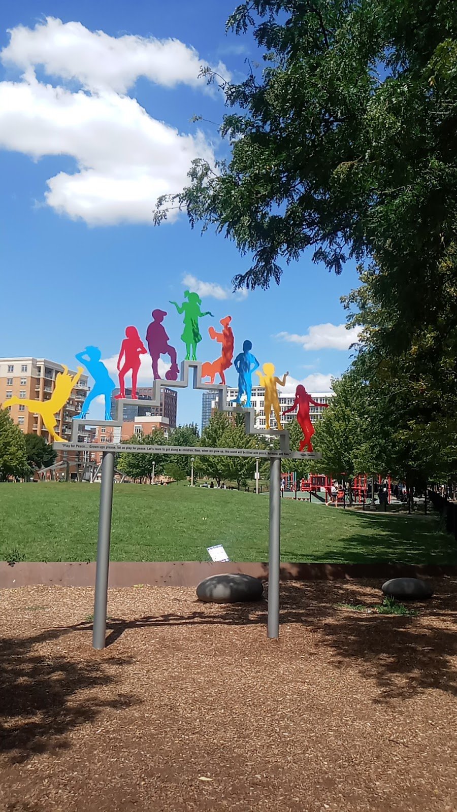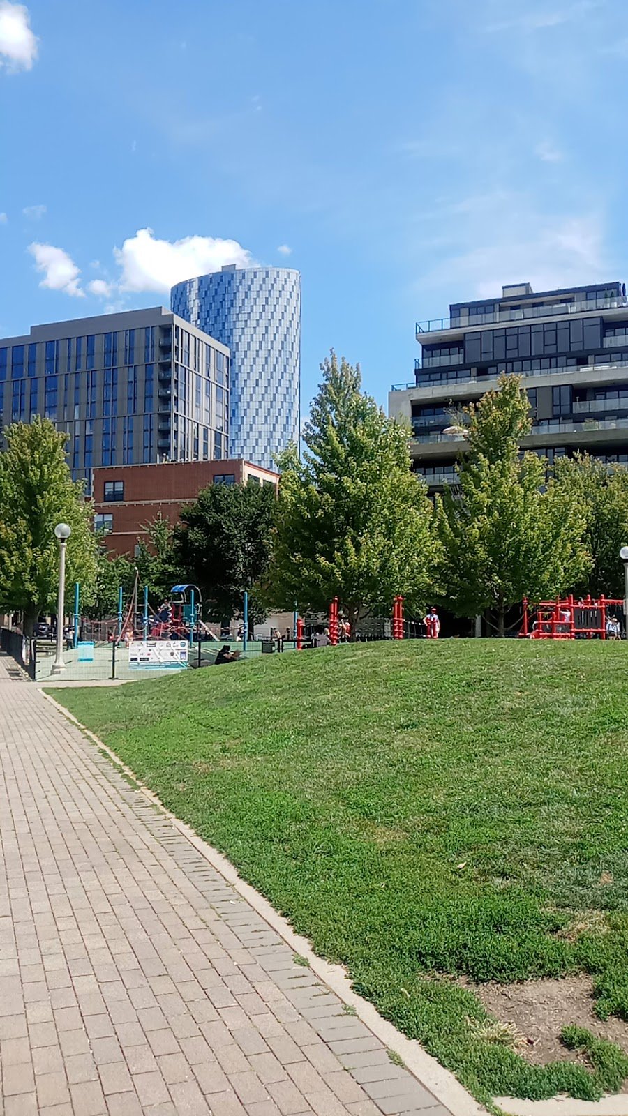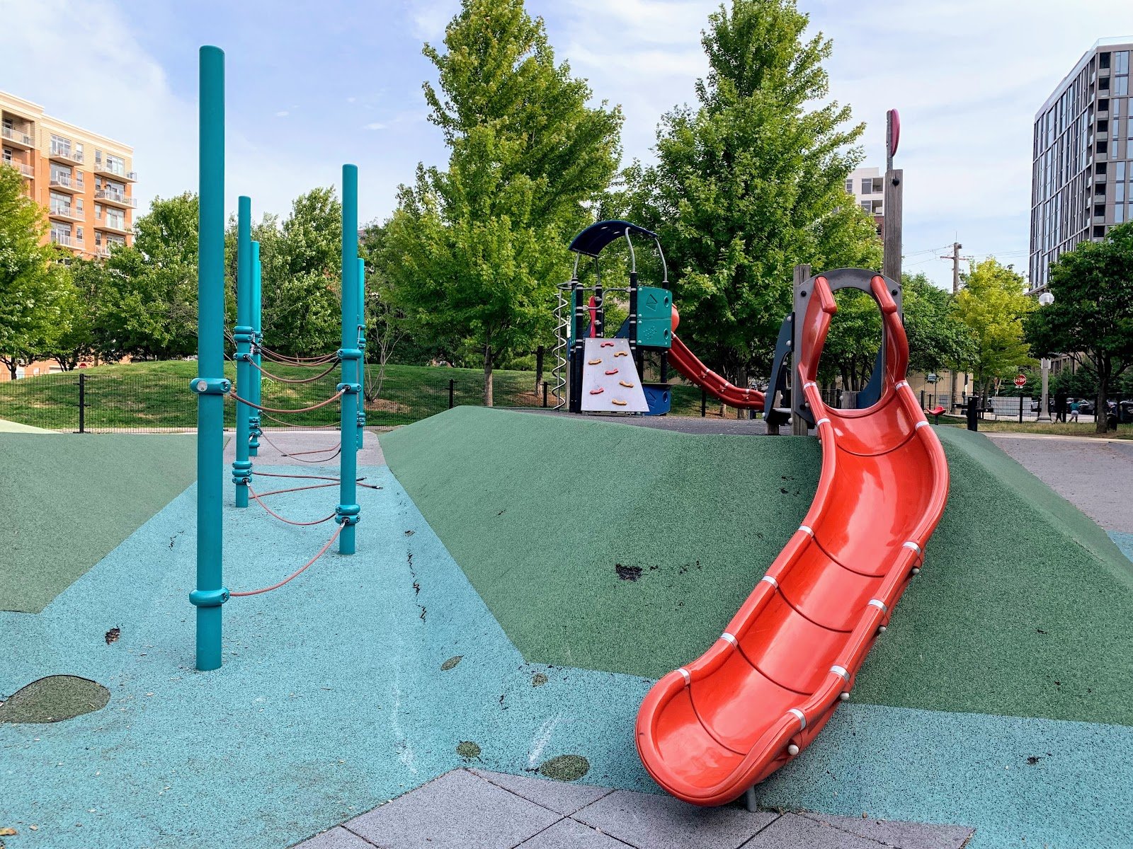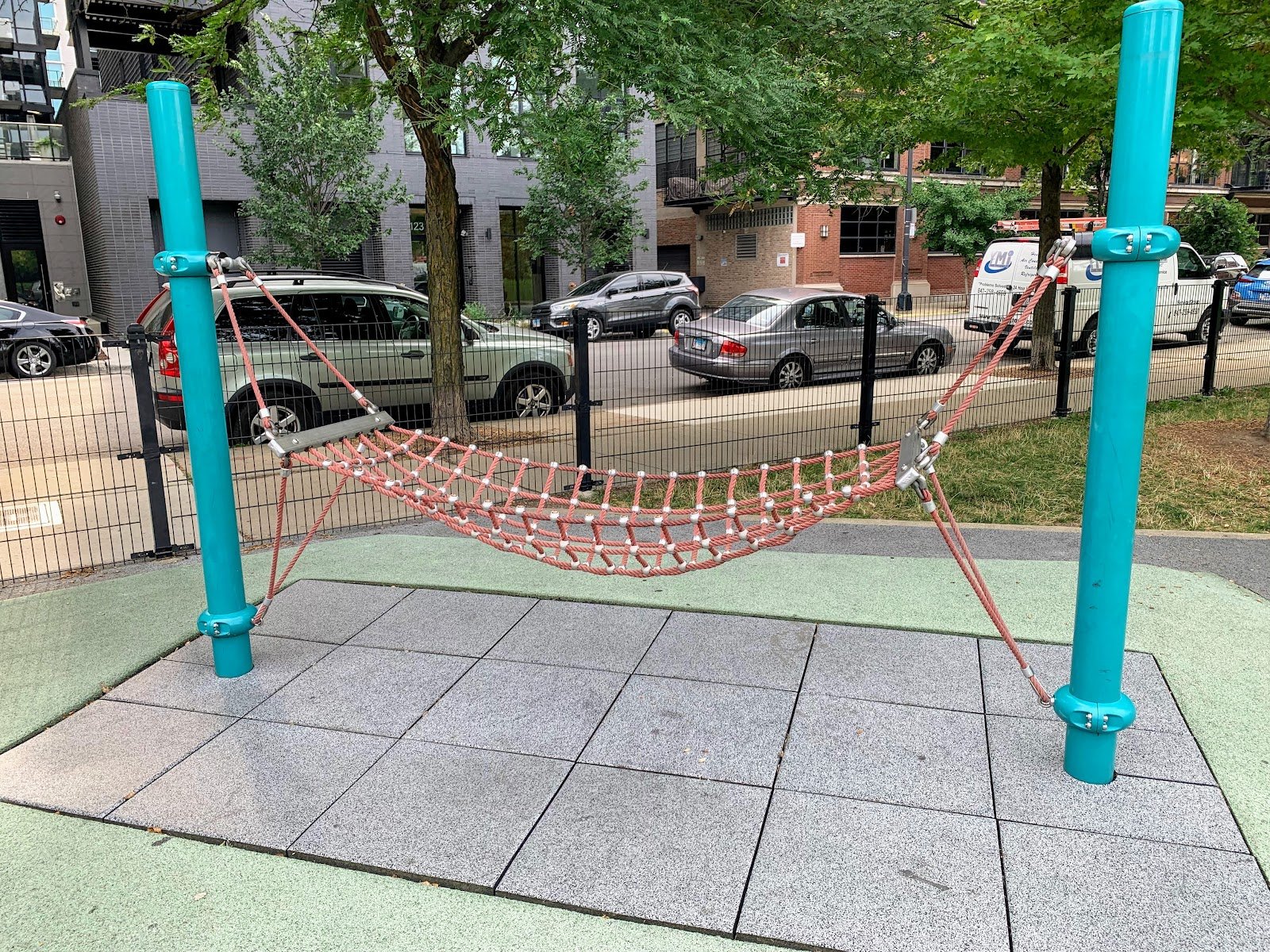 The official Chicago Park website describes the playground like this: “The children’s play area offers ADA accessibility that allows for inventive, non-linear play without traditional play equipment.” Inventive, non-linear, and non-traditional are all great adjectives to describe this playground in the West Loop. The fully enclosed playground uses the rubber surface itself as a play element; there are steep inclines and valleys that invite play. Most of the elements are indeed non-traditional. While there are a few slides, there are no swings or monkey bars in this playground. Instead there is elaborate “jungle gym” structure made of belts of black rubber, a rope climbing structure, and a smaller structure for younger children. The play area is fully enclosed and there are several picnic tables that make this a comfortable playground in a new and beautifully landscaped park.