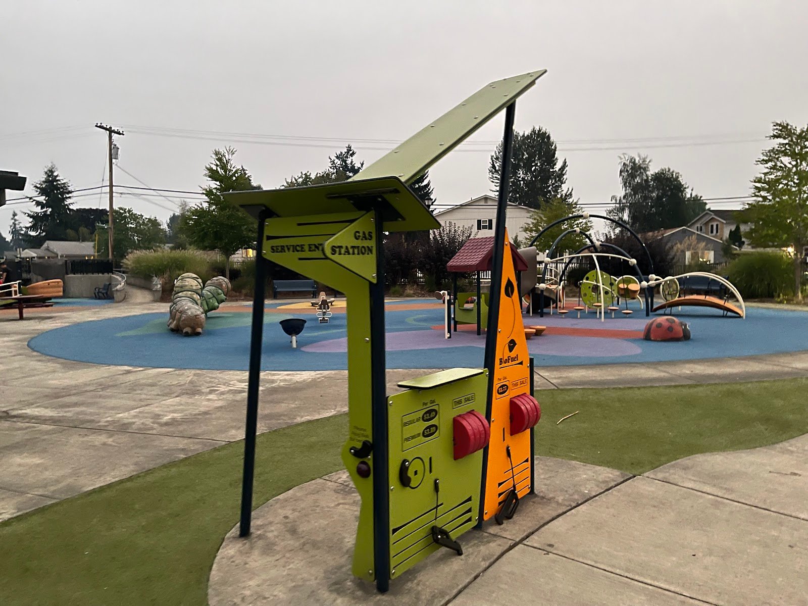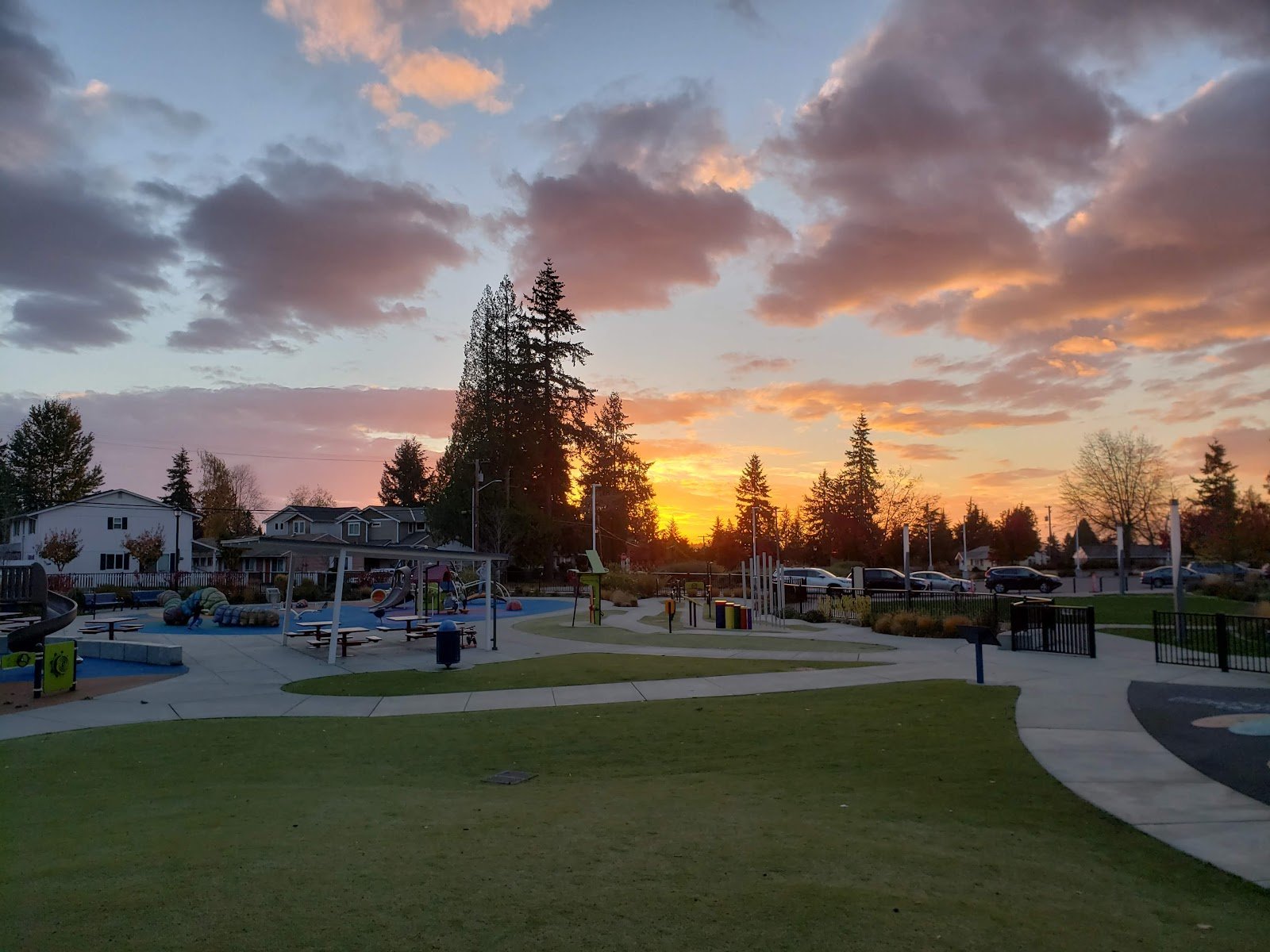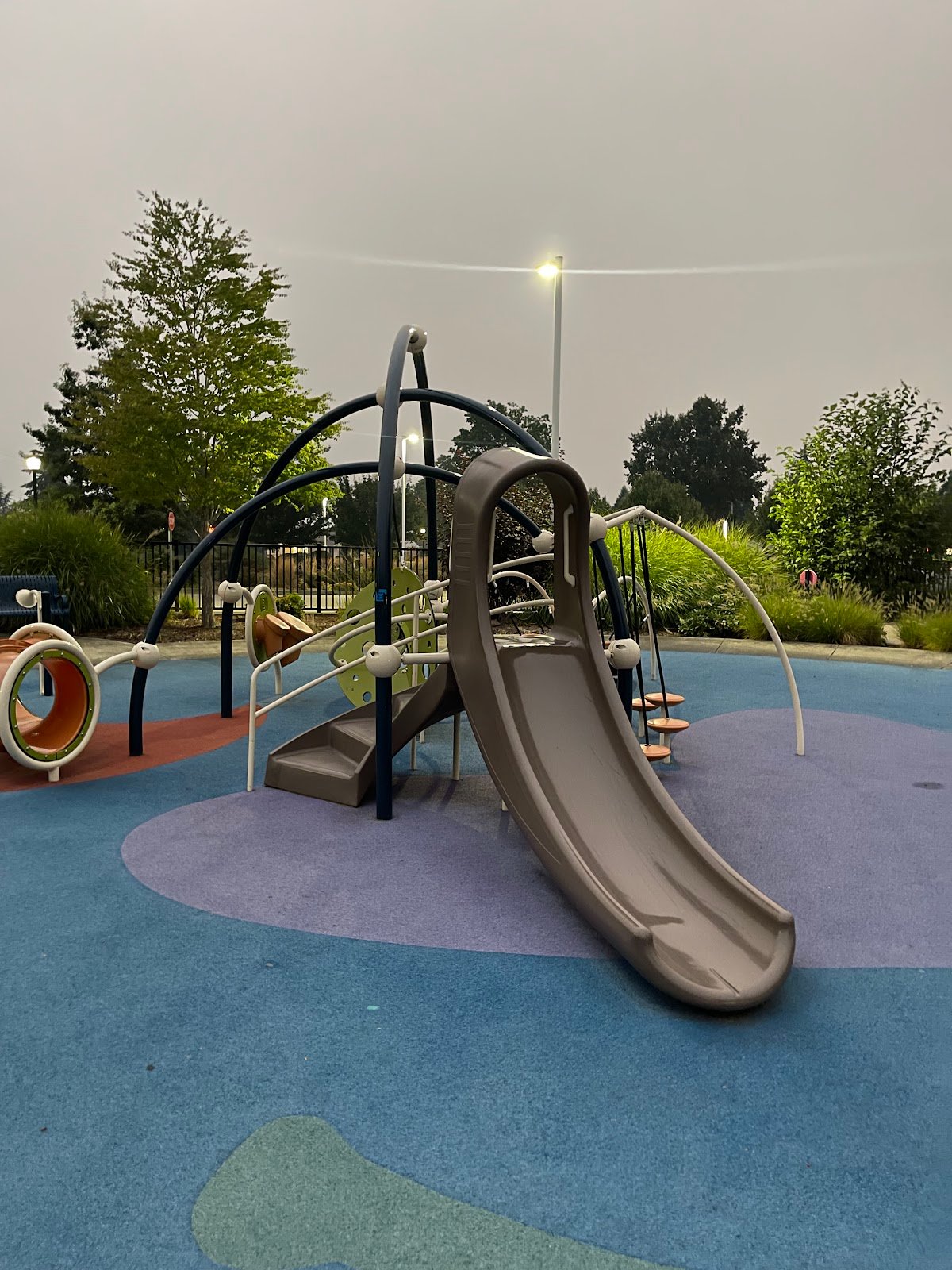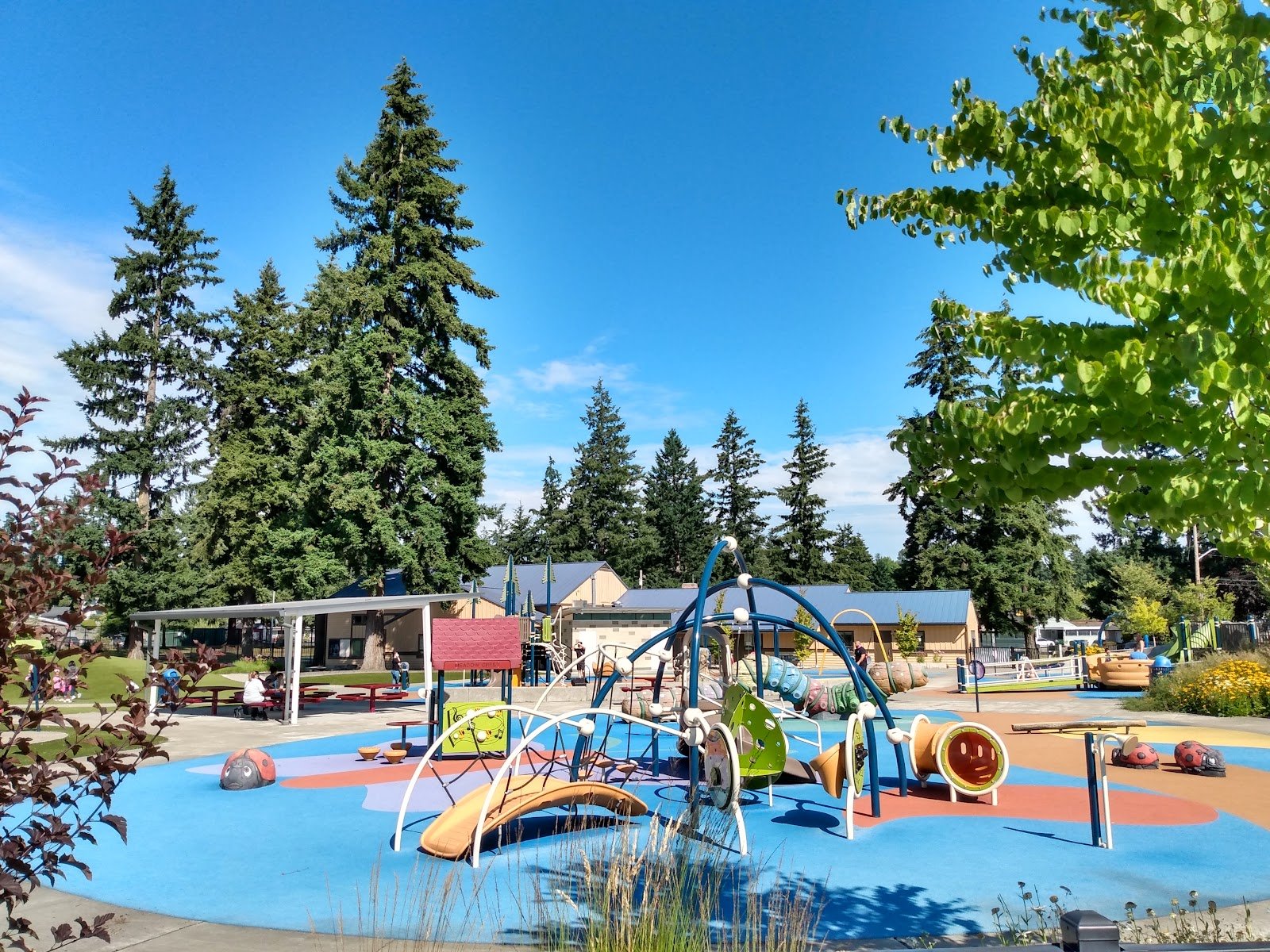 Is clean. Bathrooms are clean. The ground is soft. Lots of things for kids to explore and get challenged by. Perfect for bikes or scooters on one side of the park. I love that it is fenced in. One of my favorites, it’s just too far from us. There are tables of adults just want to sit, or for kids to grab a snack. Big swings for everyone.