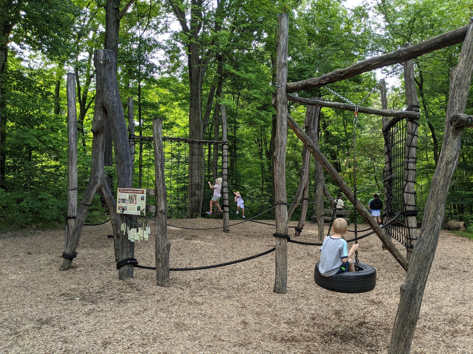 Beautiful park made from mostly natural materials instead of plastic. Most of the of park is made by chainsaw on old fell trees. There is a teeter totter, climbing ropes, teepee, and a zip line to name a few. Understandably the zip line is for older kids (5 years old and up) and adults. It is pretty fun for a small unsupervised zip line. My 6 and 9 year olds got a big kick out of kit!