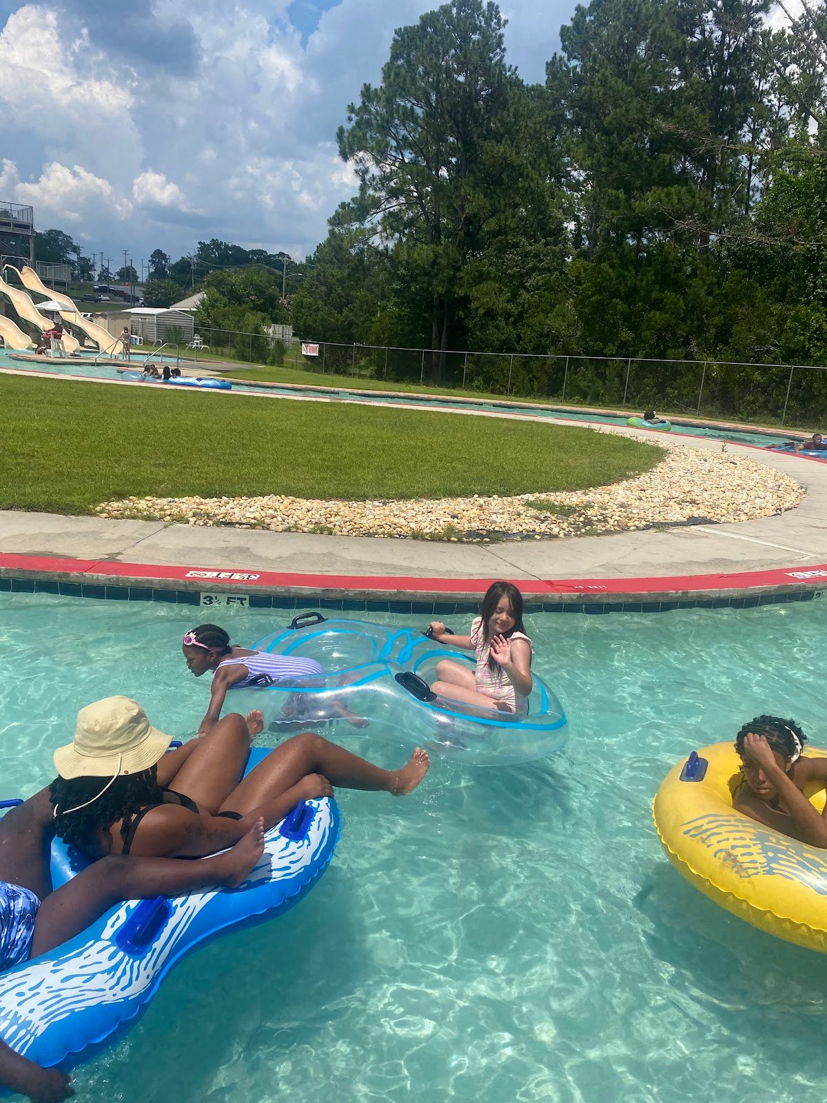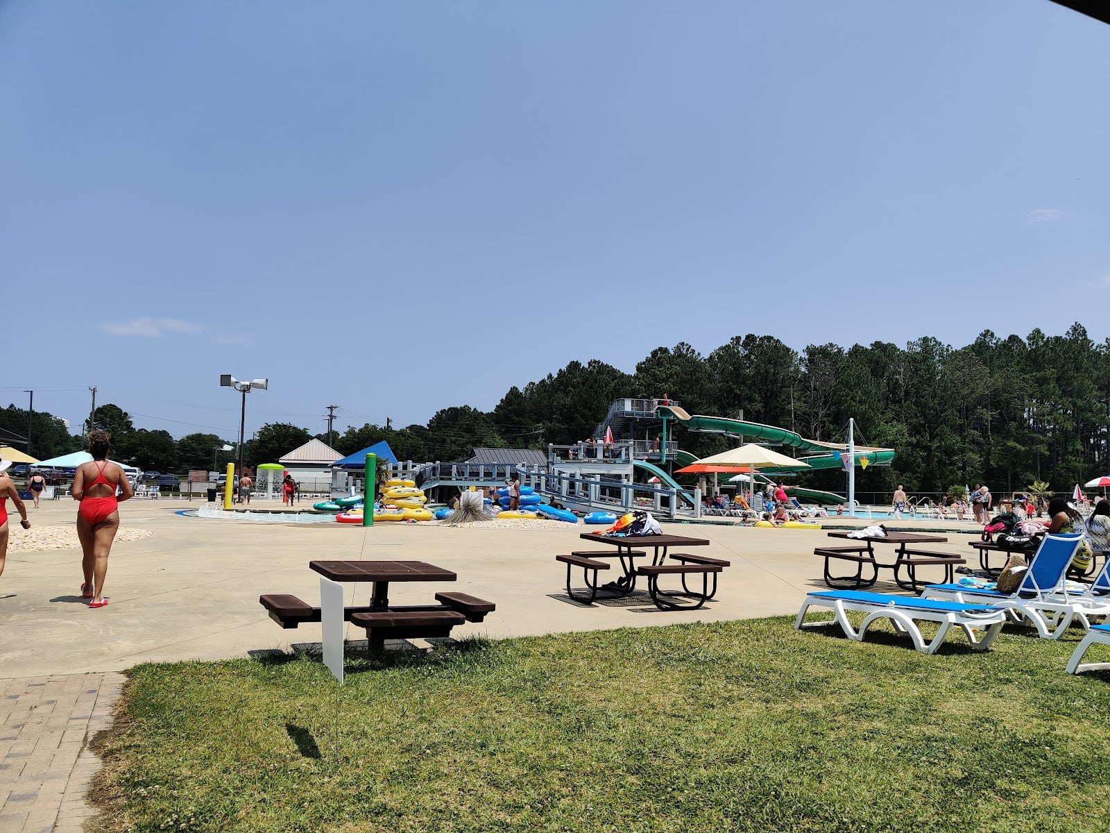 The lazy river goes around the whole park. Lots of chairs around to sit down. Multiple lifeguards around all the pool areas. Multiple slides to pick from. Snack bar available. Playground and shaded areas available. Big park enough for Multiple groups to have fun in the water. None of the water is above 5 feet so safe for all