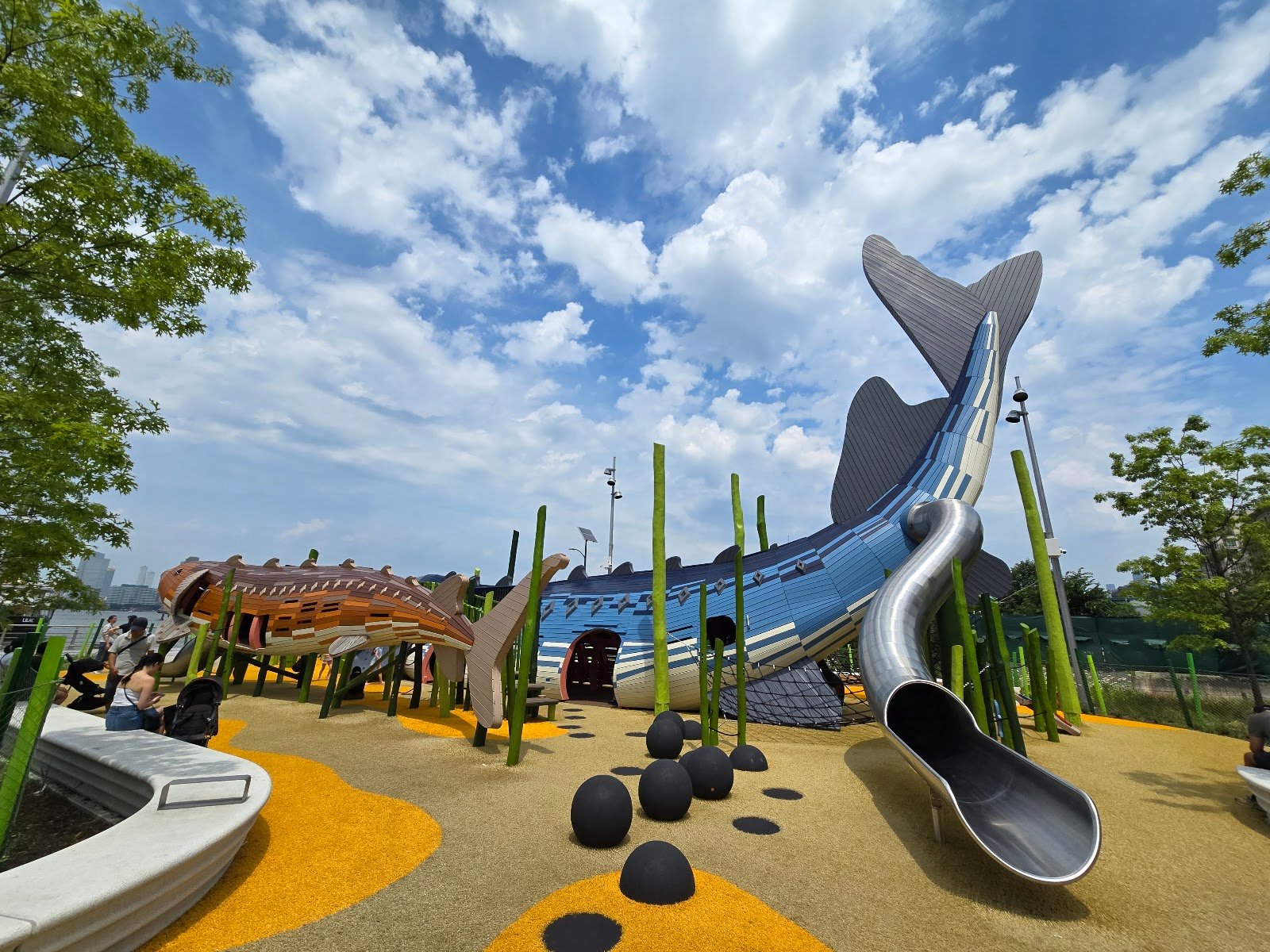 The science playground is catty corner to splash pad and playground with swings and sand. There is more shade in that playground. There is also a skatepark nearby. Although again without much shade.