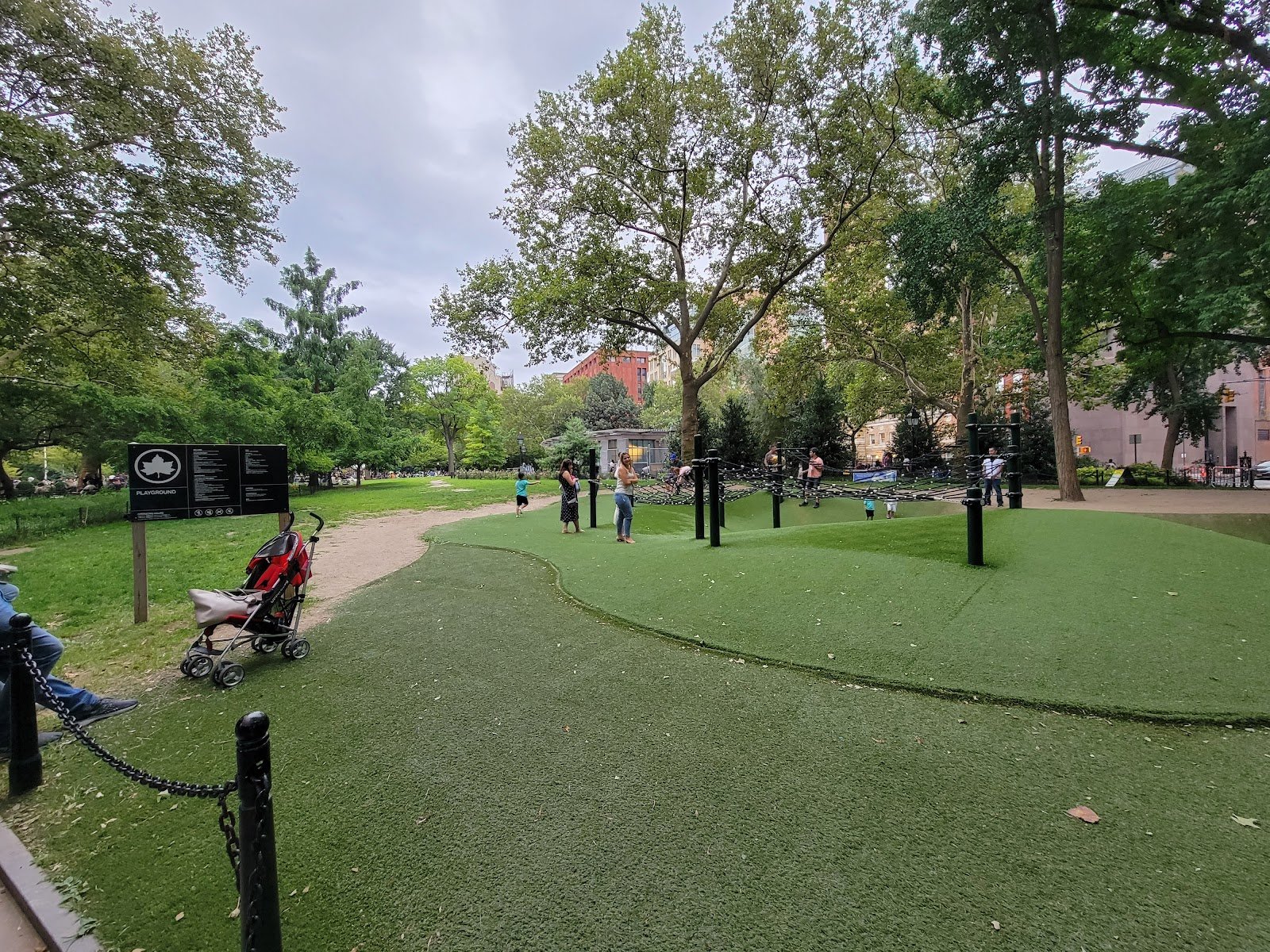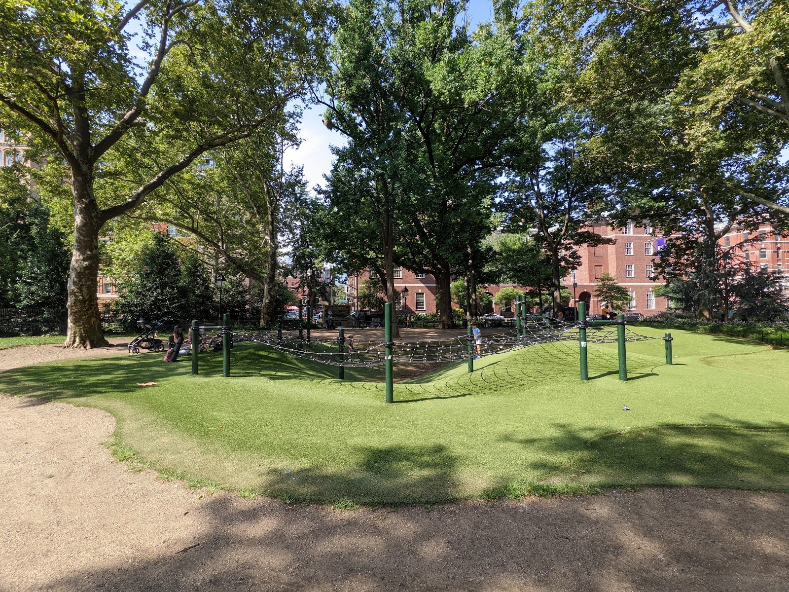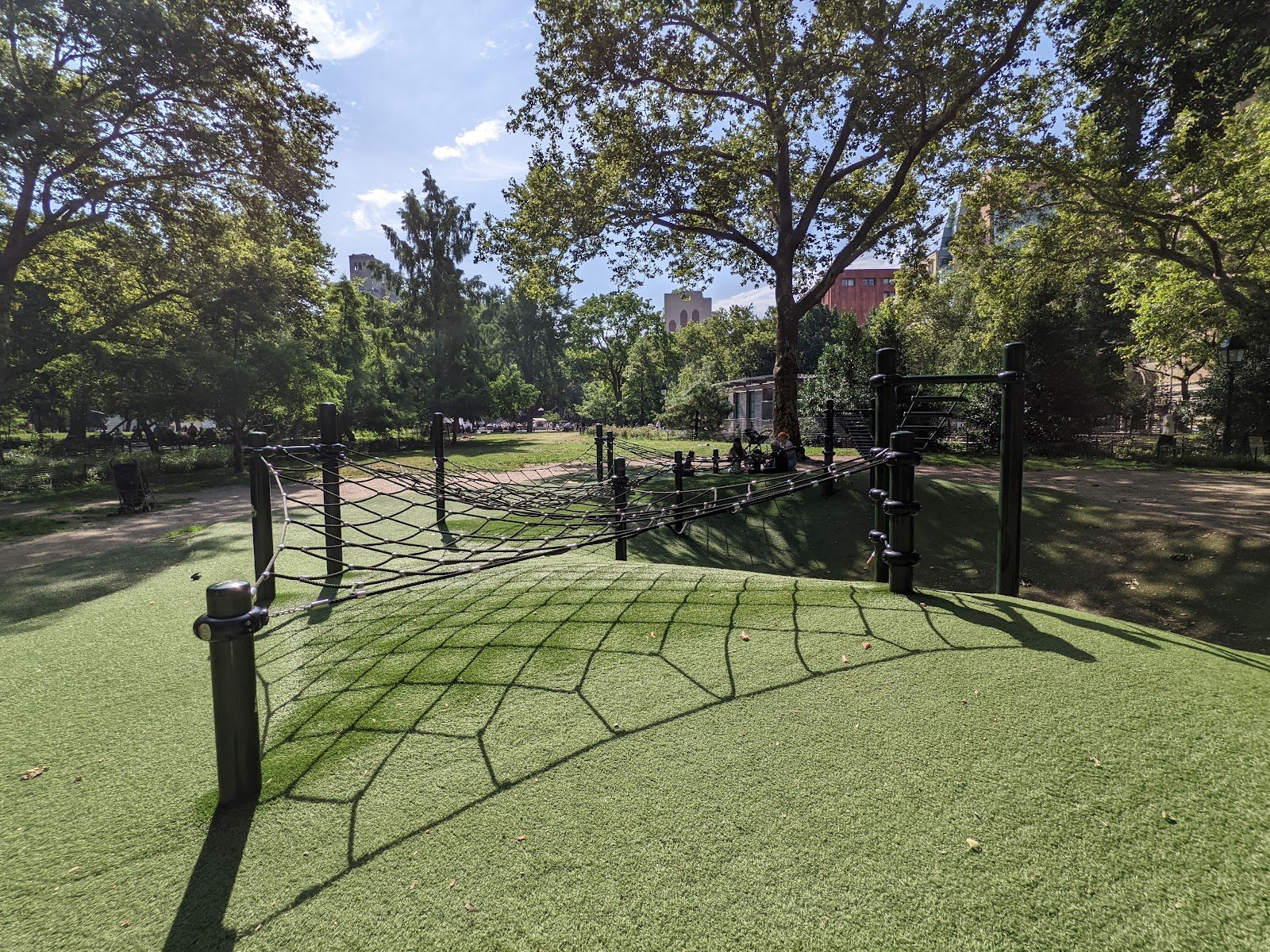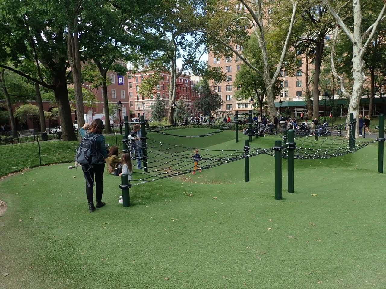 My kids adore this thoughtfully dynamic playground. It’s all about climbing/balancing. I love getting out their energy here. The ground is spongy astroturf. Great spot to have a picnic and play!