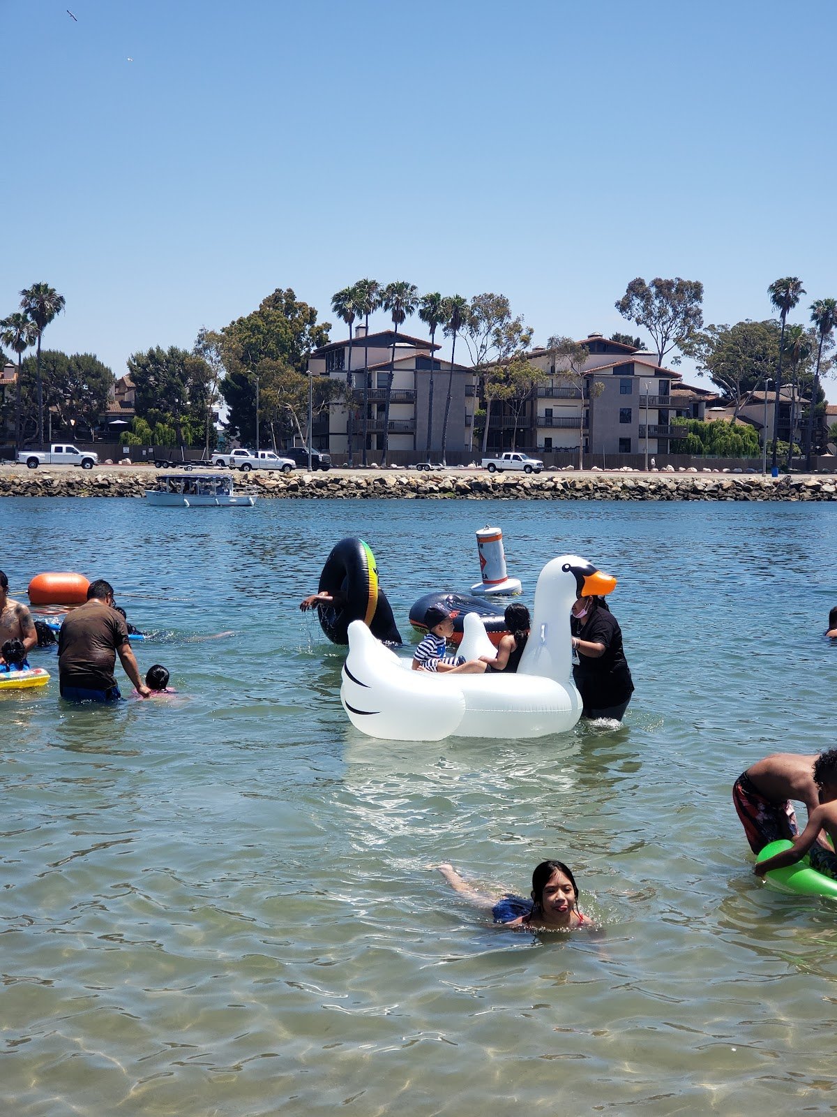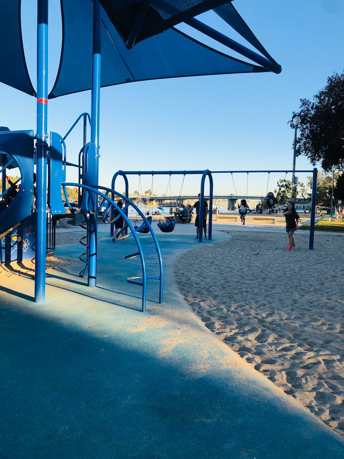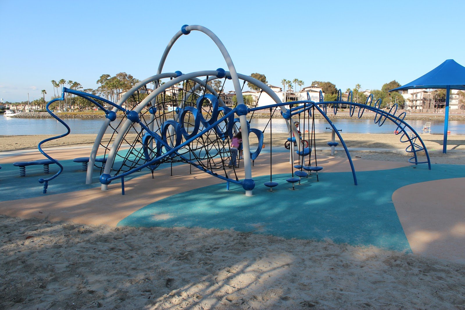 Wonderful fun playground for the kids, they enjoyed playing and exploring there. Parking is not free. When we arrived on Monday morning they were cleaning the walkway, blowing the sand off the playground. There were people doing yoga, we also saw a pelican, people kayaking. And the bathrooms were open, faucets working. So nice!