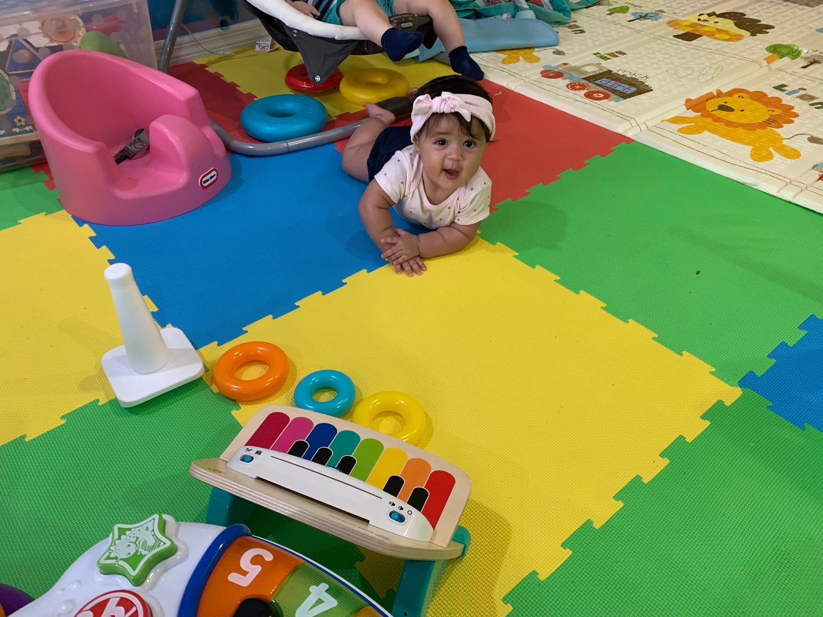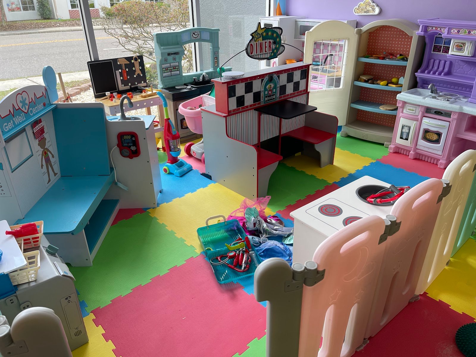 Fun and cute spot to take your toddlers! I took my 6 months old and she was amazed with all the colors everywhere. I was able to lay her down on the floor and play without worrying of bigger kids since they are divided. Definitely a nice place for your toddlers. Also, a very clean place. Kids wear only socks which are available to purchase if you wore sandals.