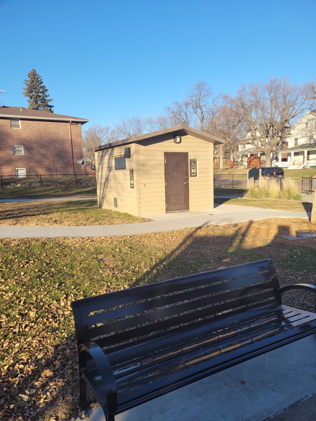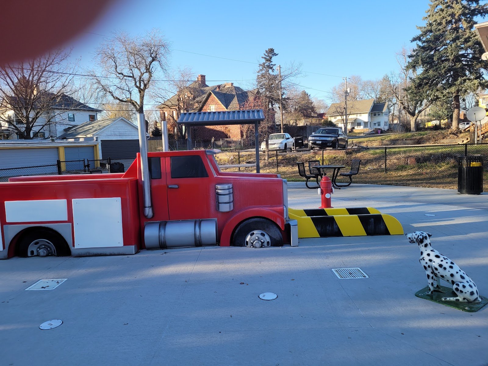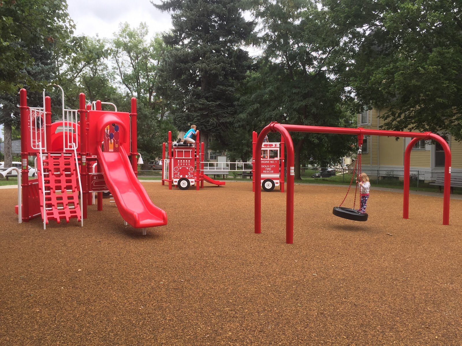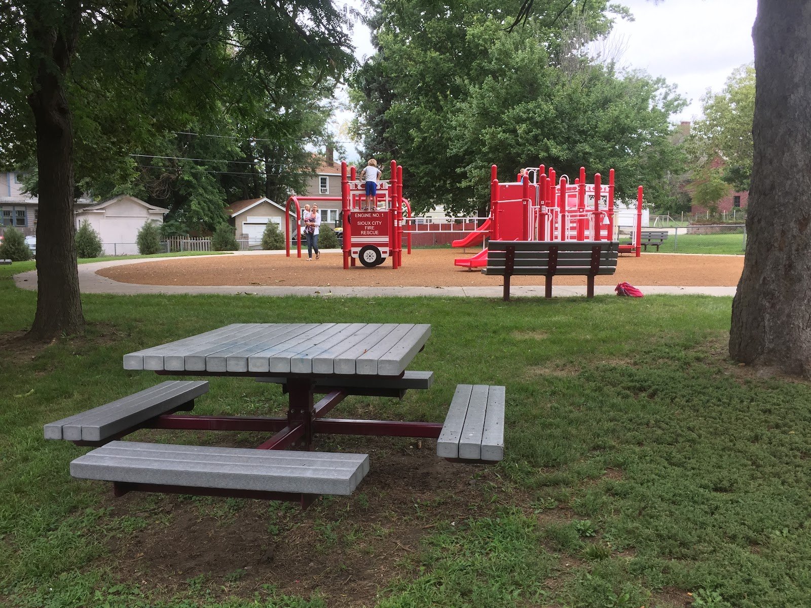 This is a very nice playground! This playground has a fire fighter theme. The sign says it is dedicated to fire fighters. Street parking only. The park has a chain link fence all the way around it. The main entrance is on Grandview Blvd. The concrete path is ADA accessible. Its a bit steep but short. The play surface is a soft and squishy rubber material. The play structures were very new in August 2016. This park has two picnic tables and two additional benches. It has one trash can. There are NO restrooms. The park has a half court basketball area with one hoop. This park is small but very nice.