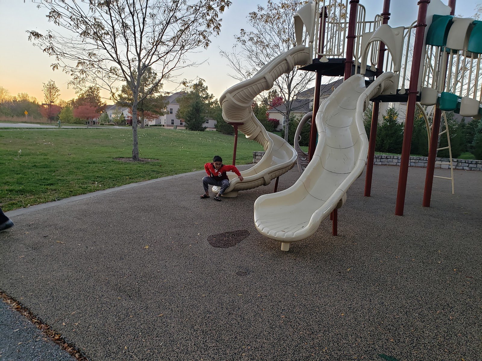 Great park, shaded by trades and back dropped by a pond. Playground equipment is in great condition and super soft bedding. A great experience.