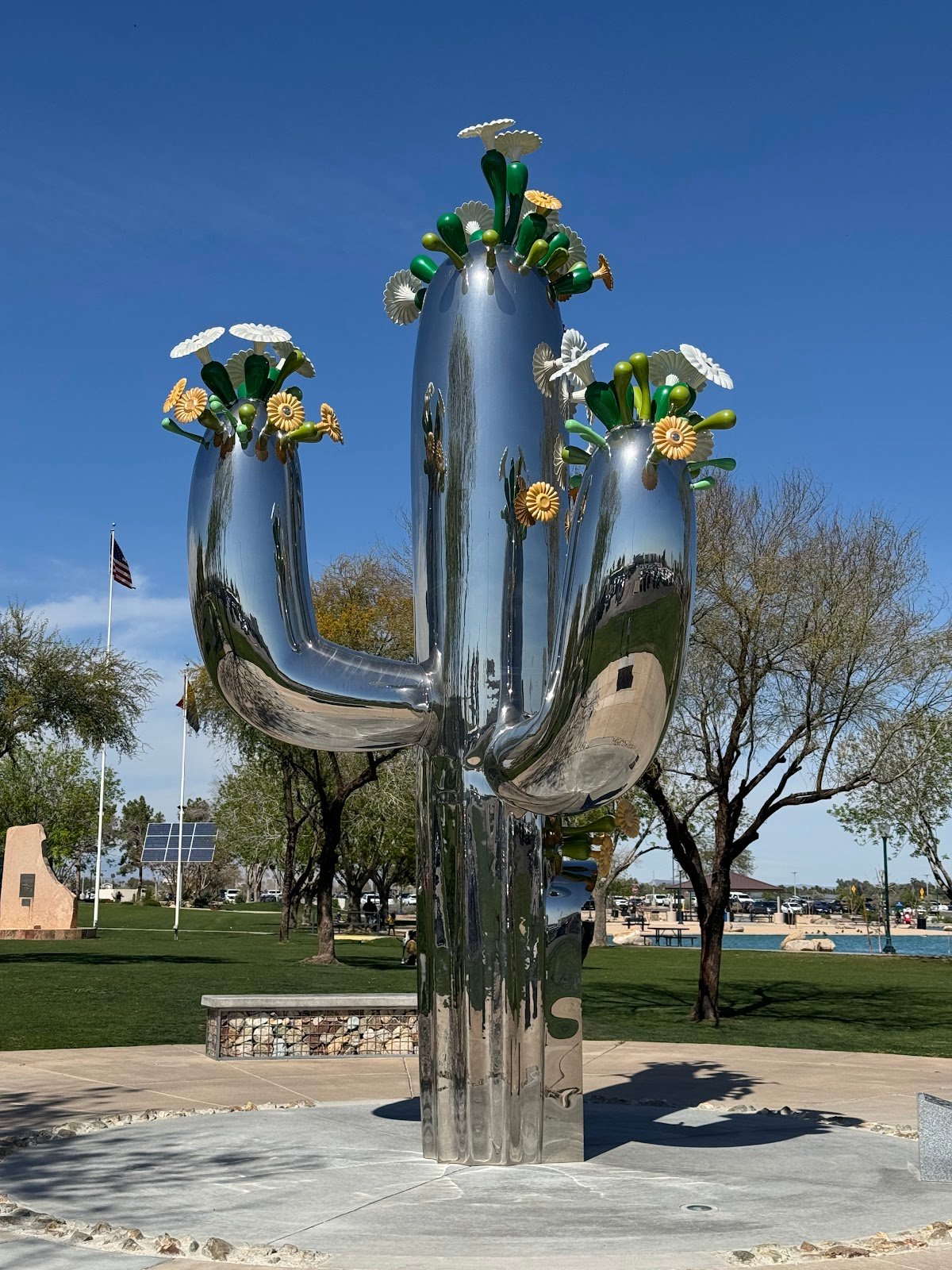 Spontaneous fishing event with my grandson. Lake Surprise is close by and is stocked. We arrived and asked if we could borrow a worm. Two kind men gave us two worms, one we used as bait, and the second my grandson wouldn’t let us use, he’s starting a worm farm. As we fished, the lake was restocked. There were many fishing and picnicking. Seats, picnic tables, and grass were used to enjoy the possibilities. Next, the grandson hooked up with kids on a well equipped playground. While we were fishing, a nice man gave us tickets for a college baseball game. As the grandson has little experience with baseball, the tickets gave us the opportunity to check out the baseball stadium and see a couple of innings. There are so many photo opportunities and people kind enough to help us and take our pictures. You’ve got to check out the beautiful cactus in the center of an active area.