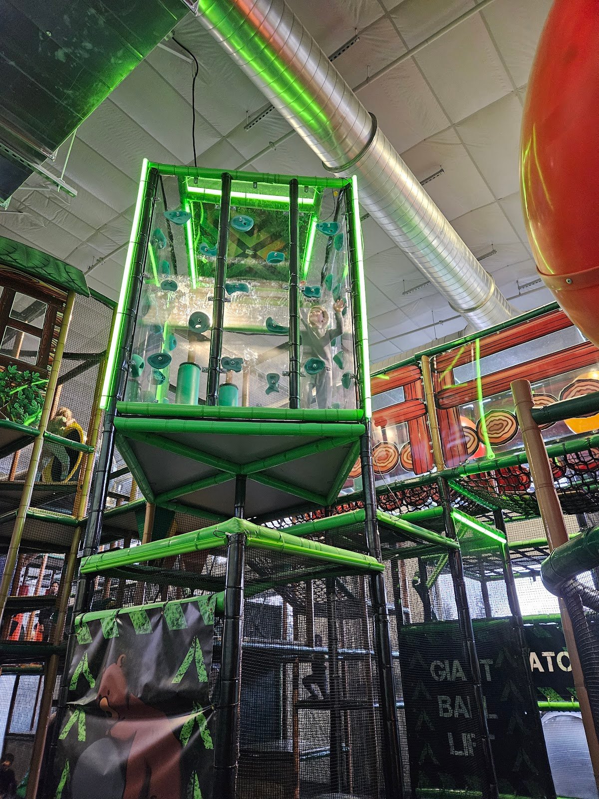 There is a cool interactive rock climbing wall the kids like and the entire play structure is themed like a tree house. There are plenty of tables for the adults.