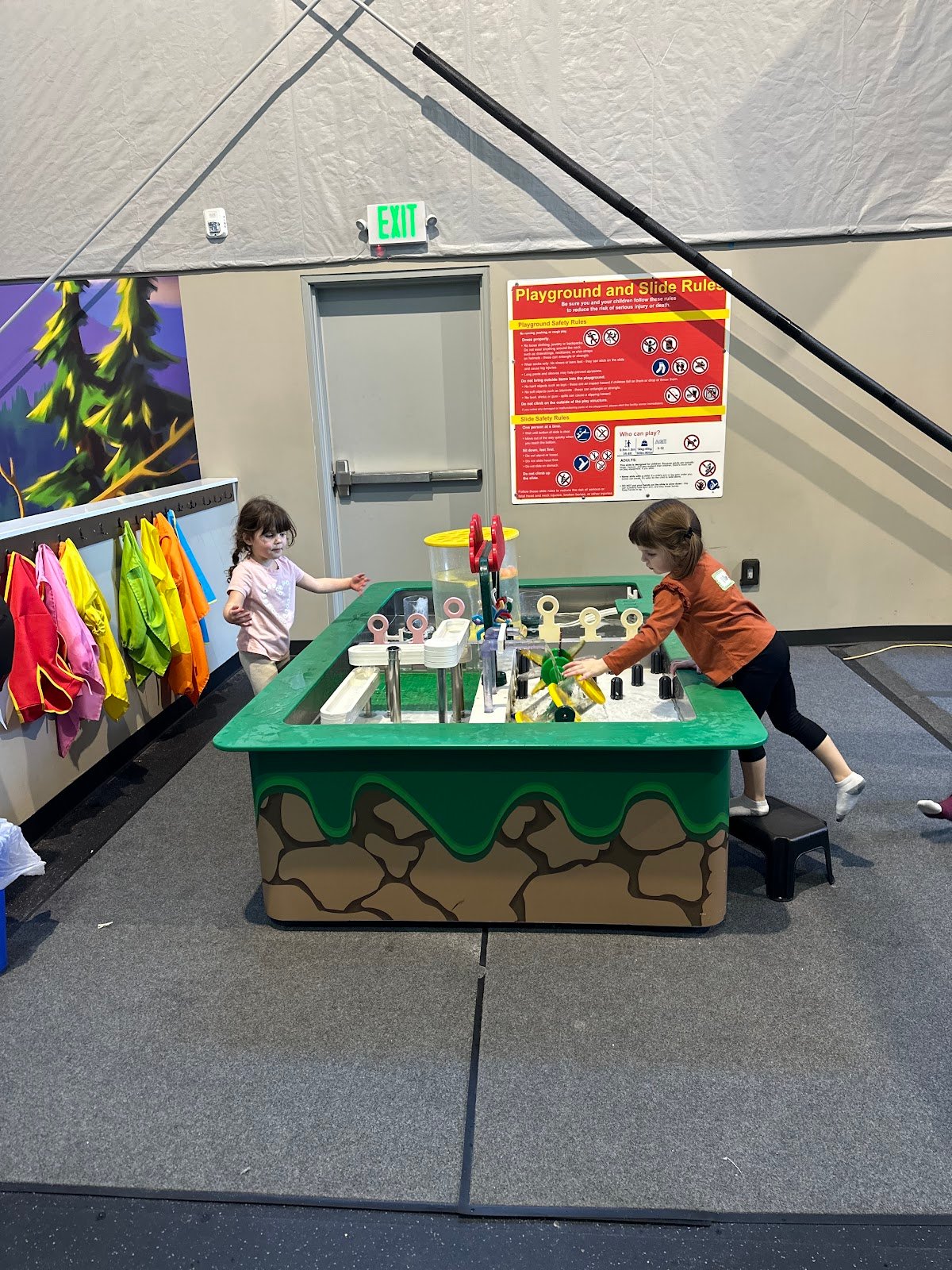 There is also a toddler area that is closed off for safety. A sand table for kids to play with. And a water table as well.