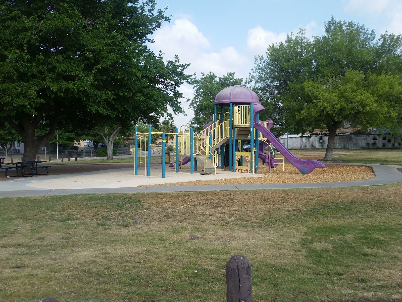 Grass is nice and green… picnic tables…equipment for kids to play on .. spacious parking .. plenty if shade